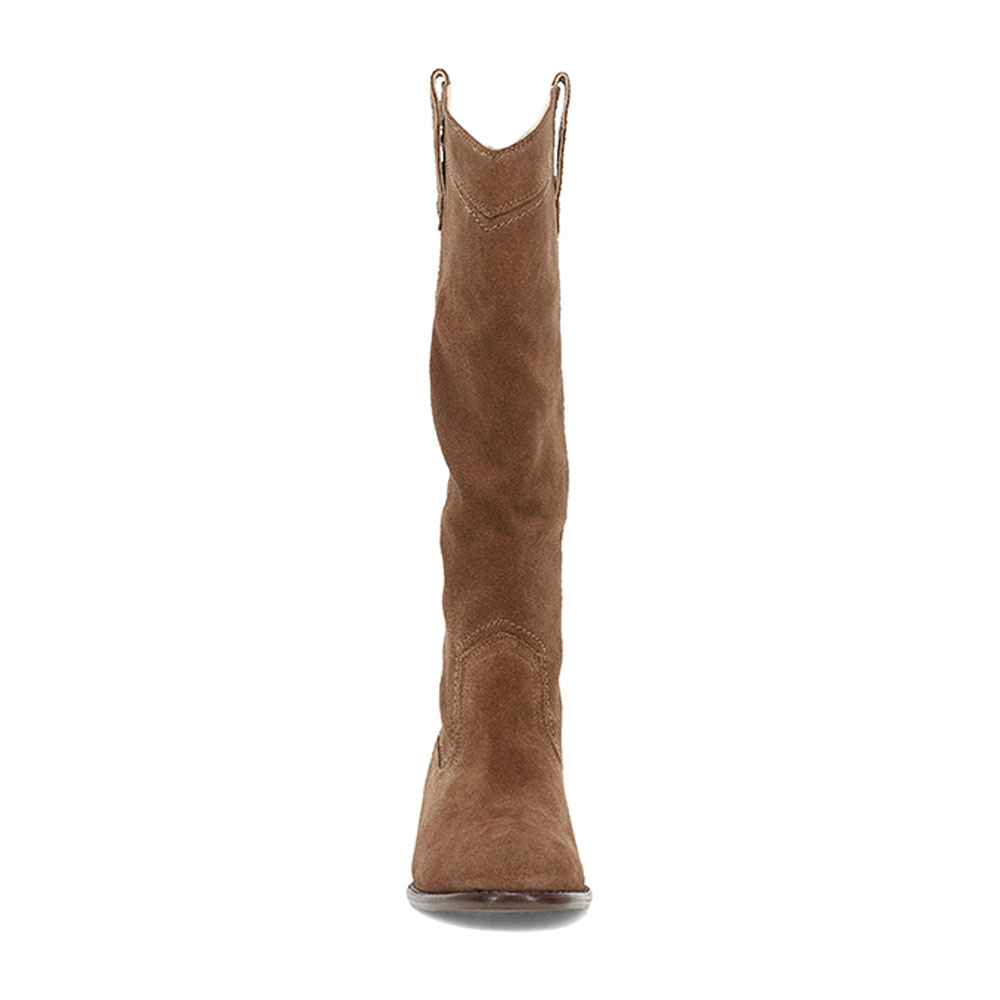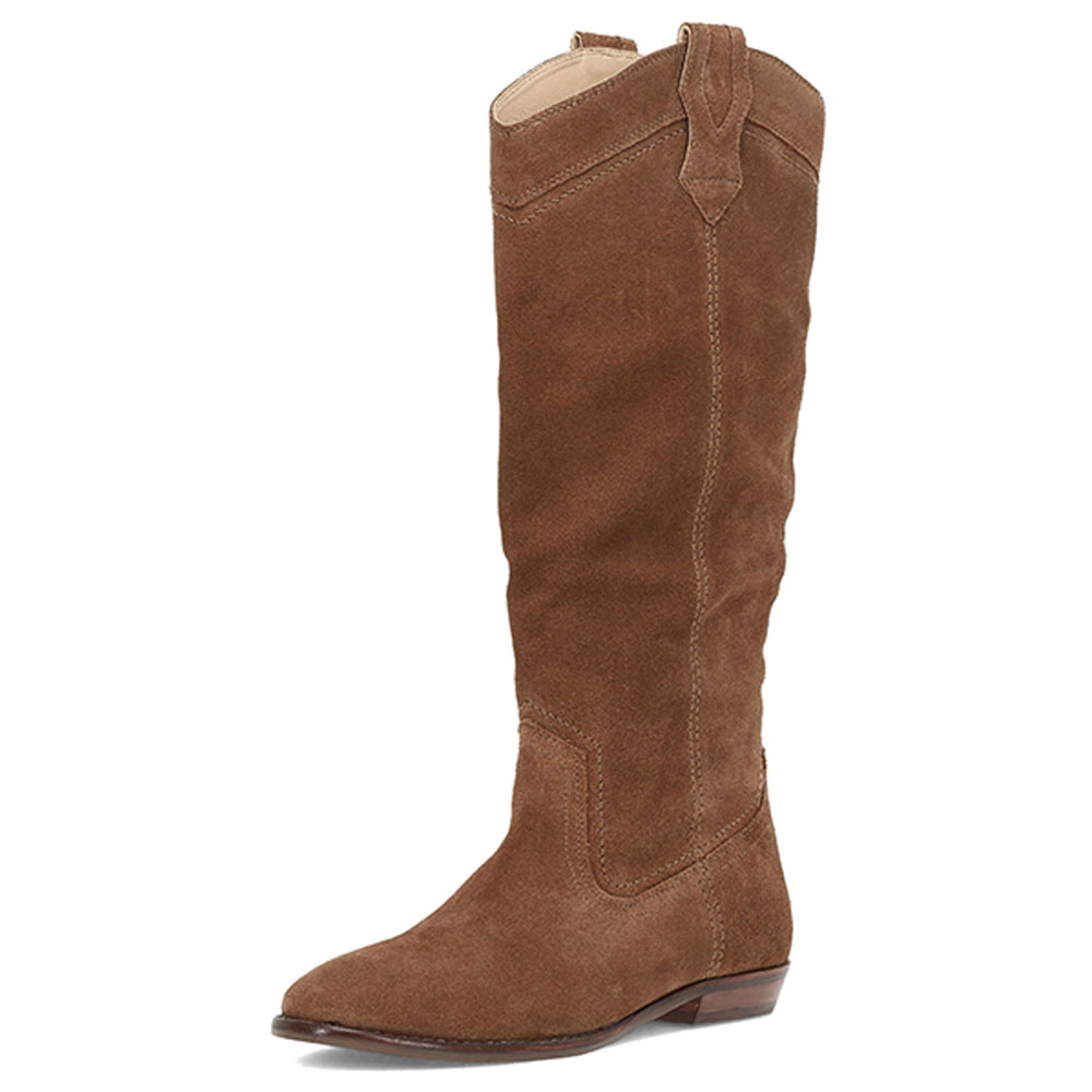 Brown Vegan Suede Round Toe Pull-On Flat Western Boots for Women