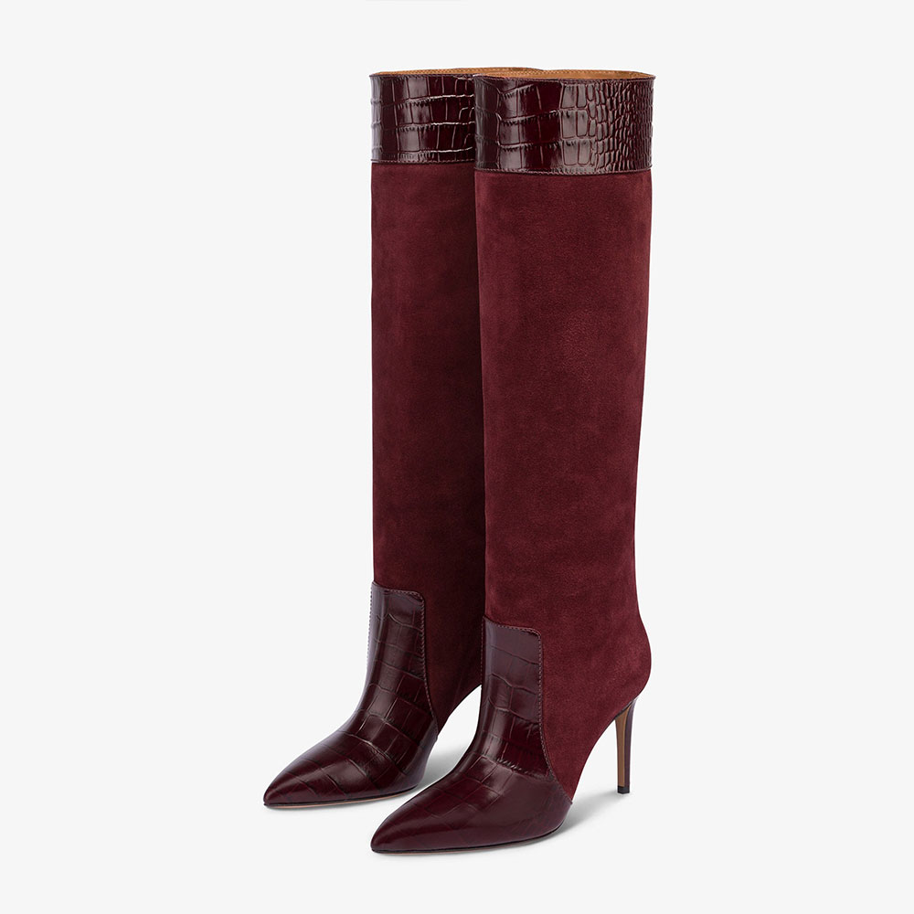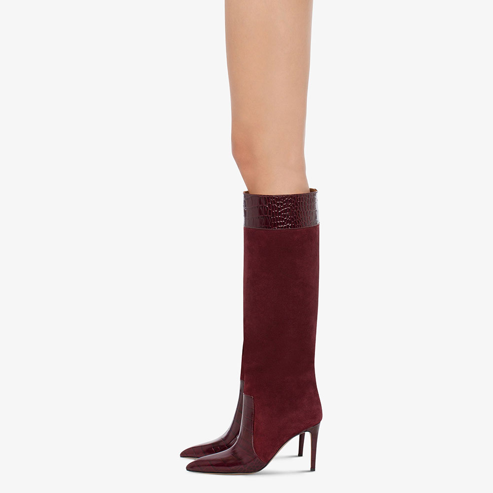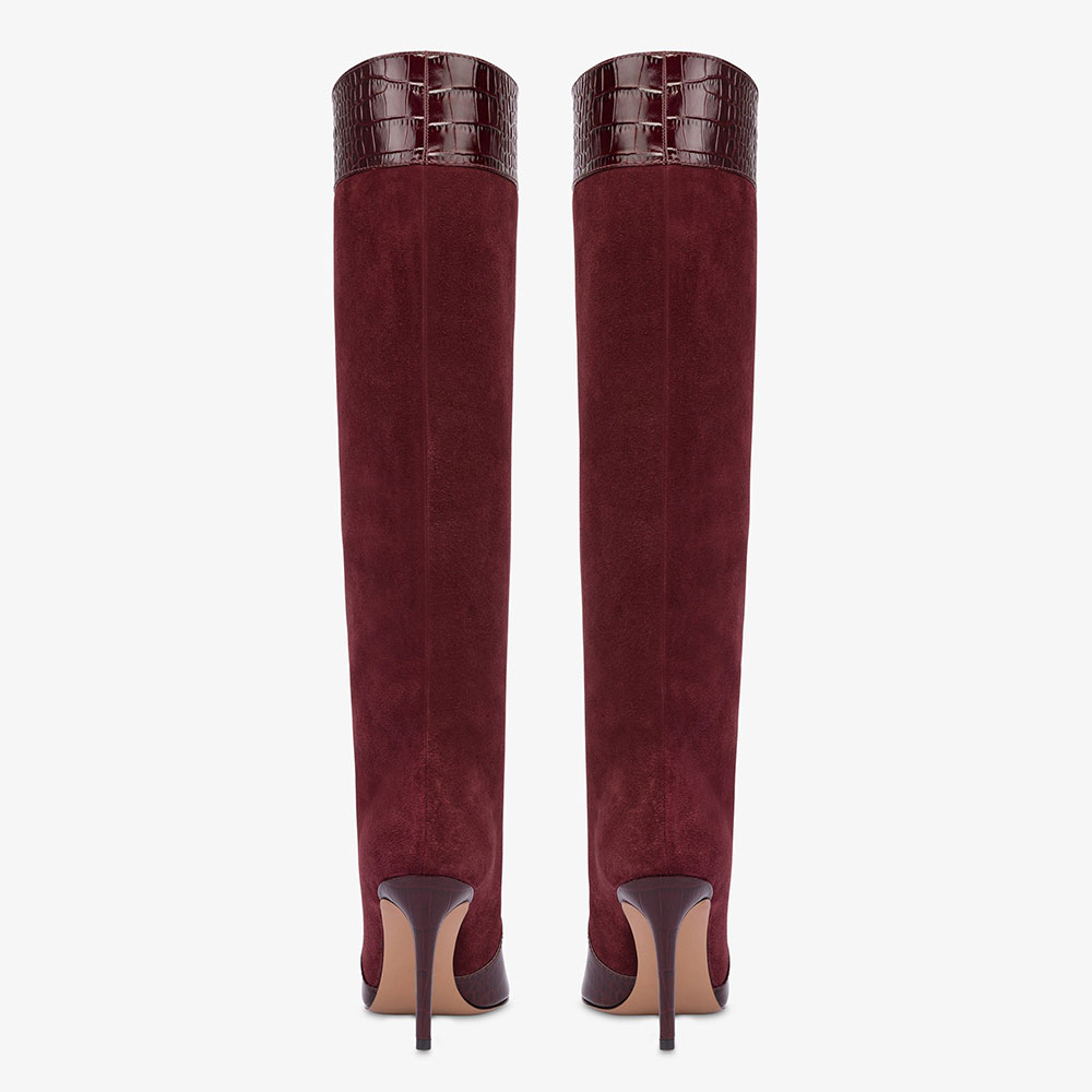 Burgundy Croco Embossed Stiletto Heel Knee High Boots for Women