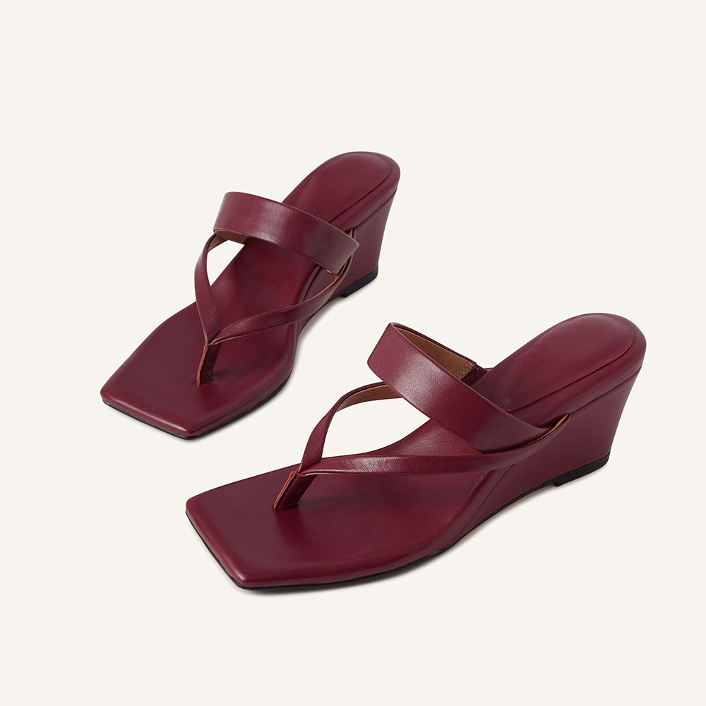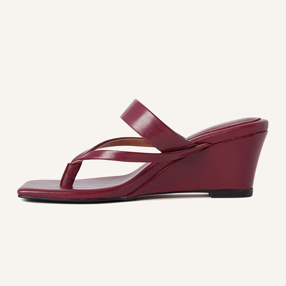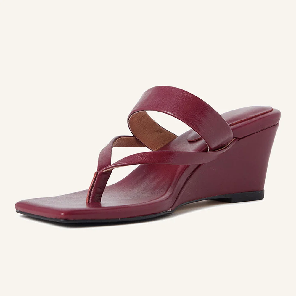 Burgundy Vegan Leather Open Square Toe Wedge Sandals for Women