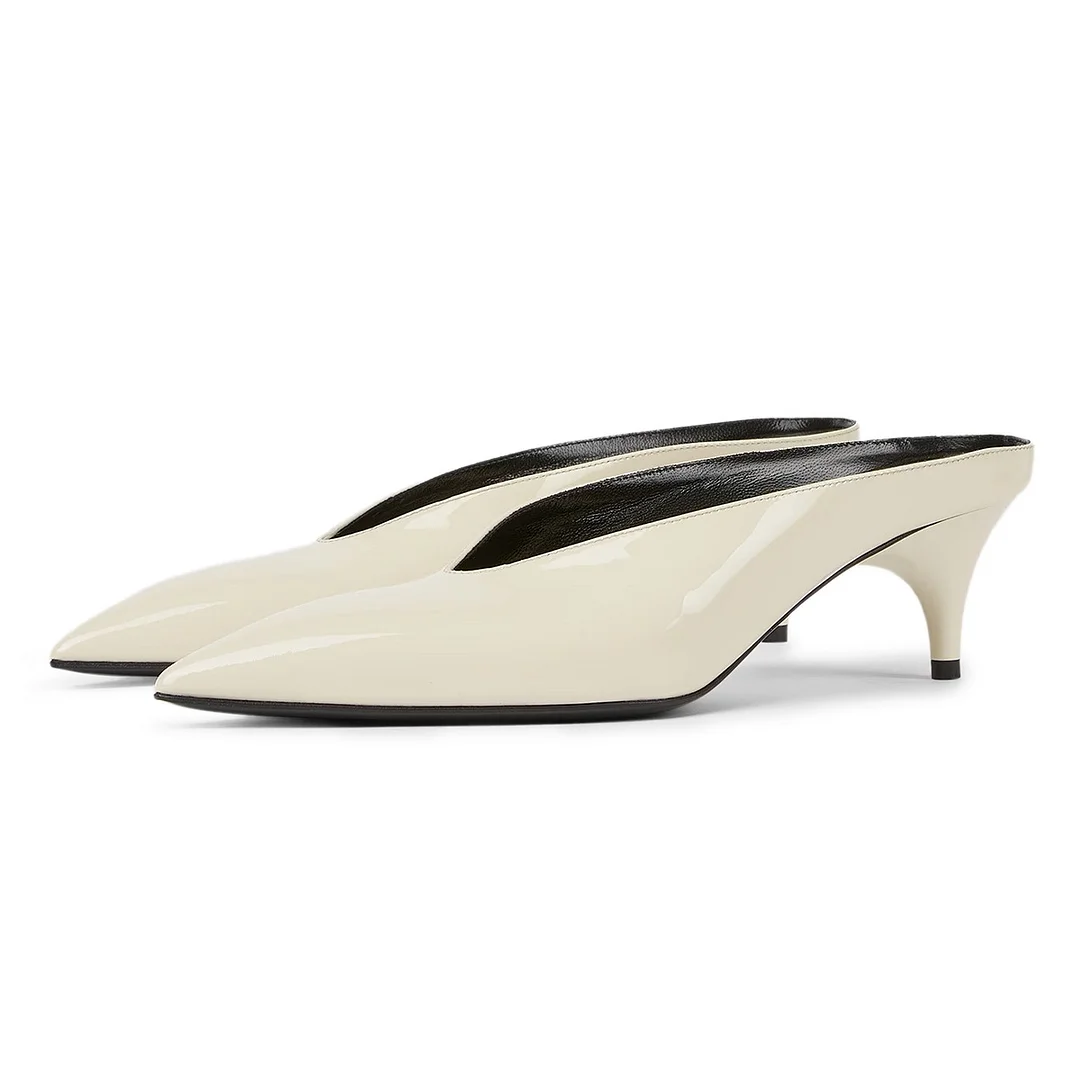Casual V-Cut Pointed Toe Kitten Heel Ivory Mule Shoes for Women
