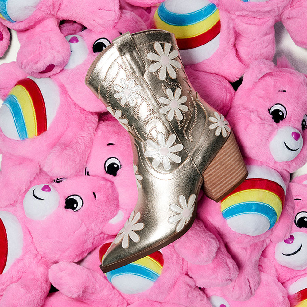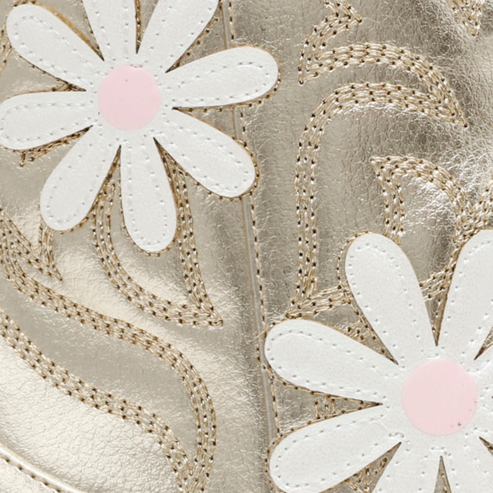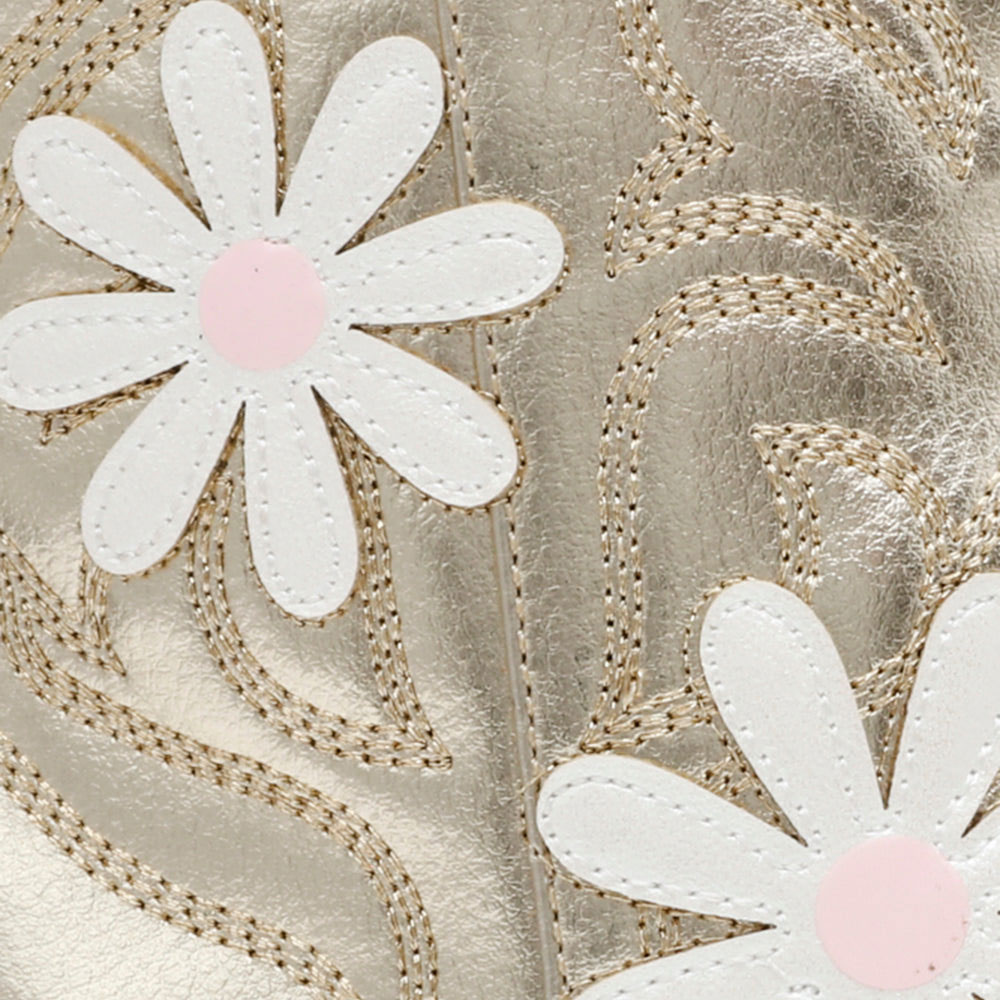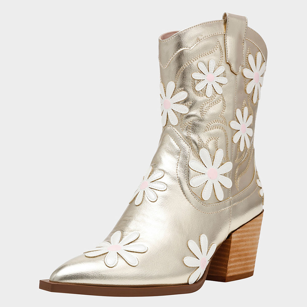 Champagne Pointed Toe Flower Stacked Heel Zipper Booties for Women