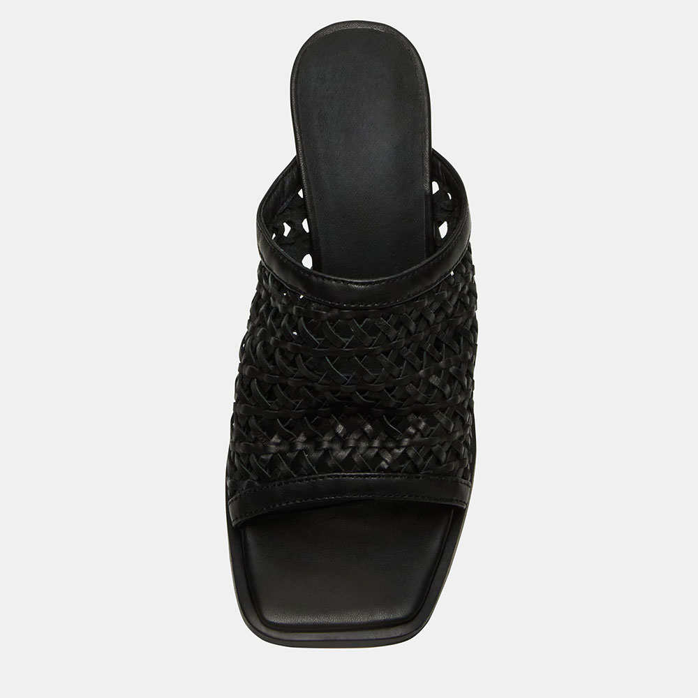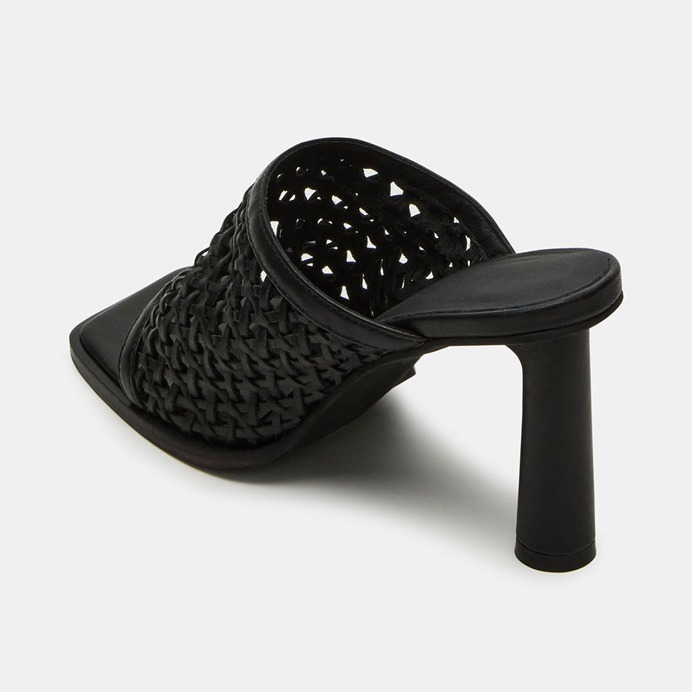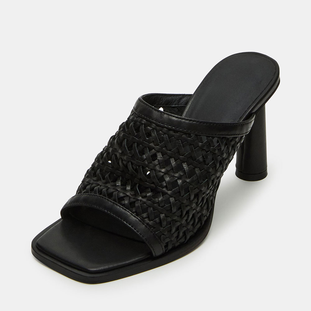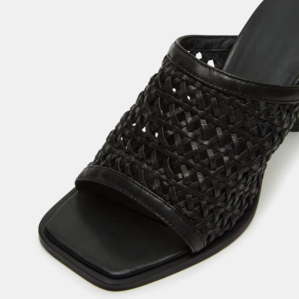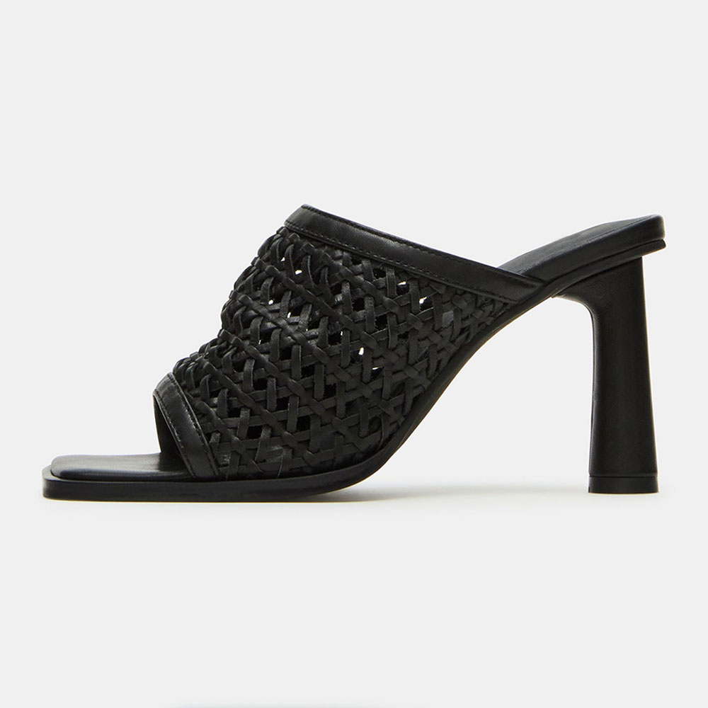 Special Designs: The open-toe mule sandals feature cylinder heels and a woven design.