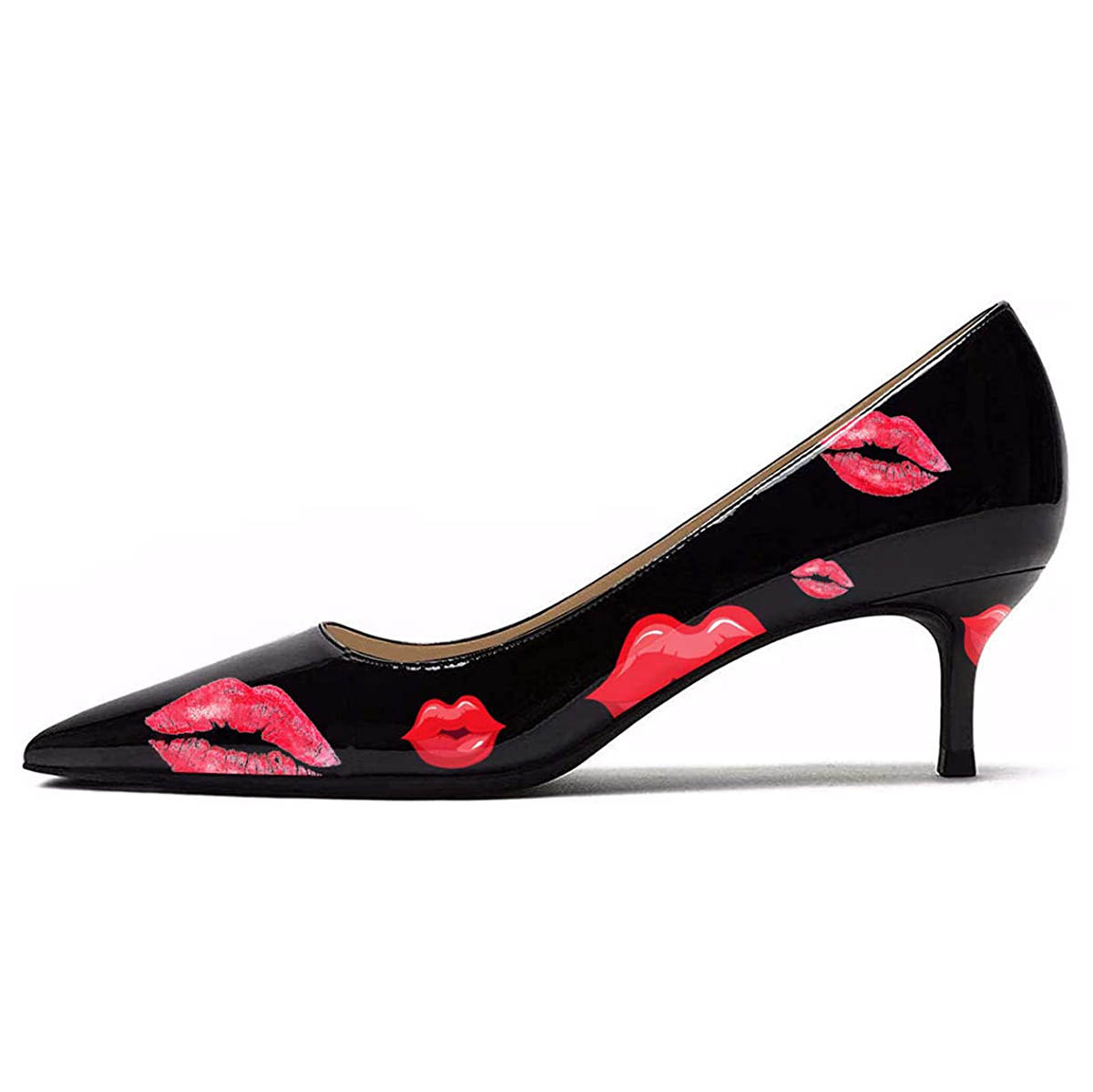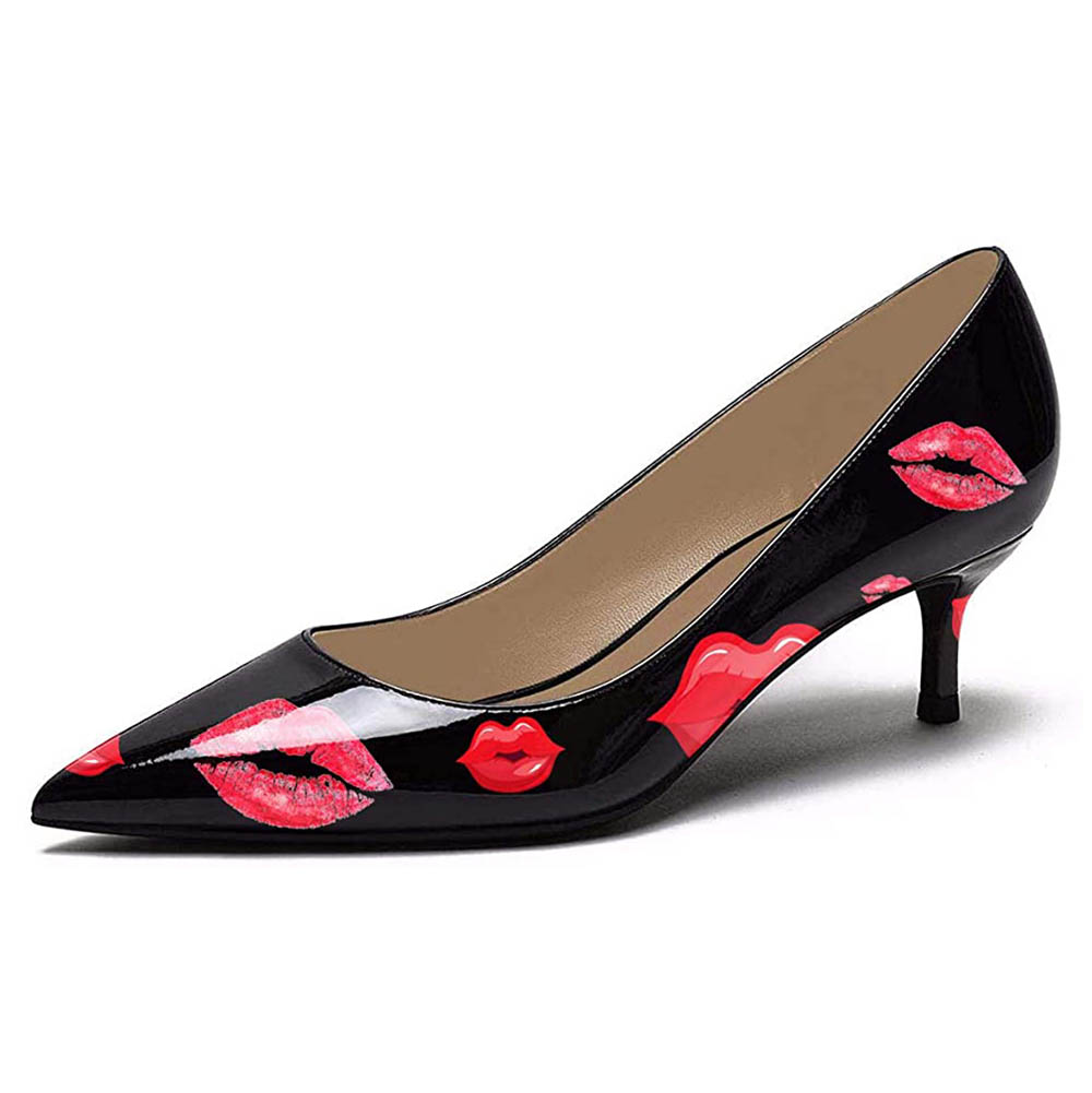 Chic Black & Red Kiss Print Kitten Heel Pumps with Pointed Toe