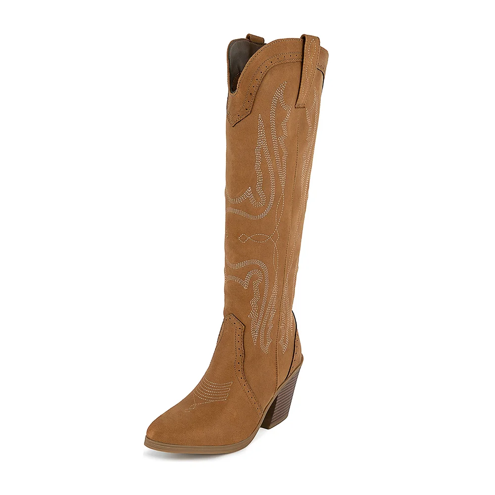 Chic Brown Pointed Toe Chunky Heel Embroidered Cowgirl Boots