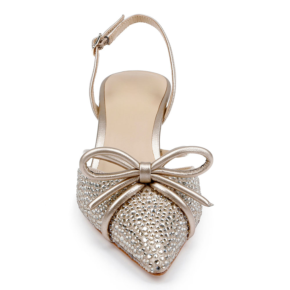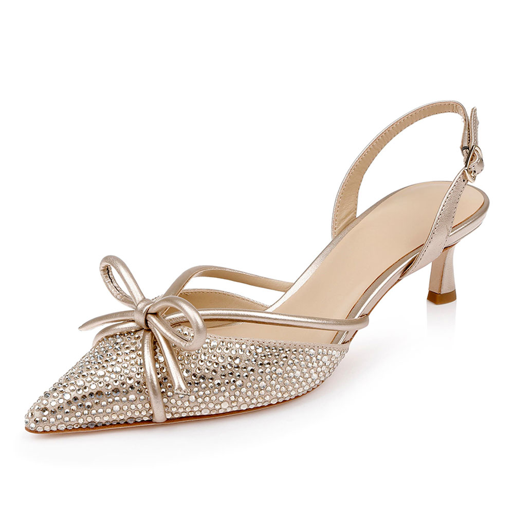 Chic Champagne Kitten Heel Slingback Pumps Shoes with Rhinestones