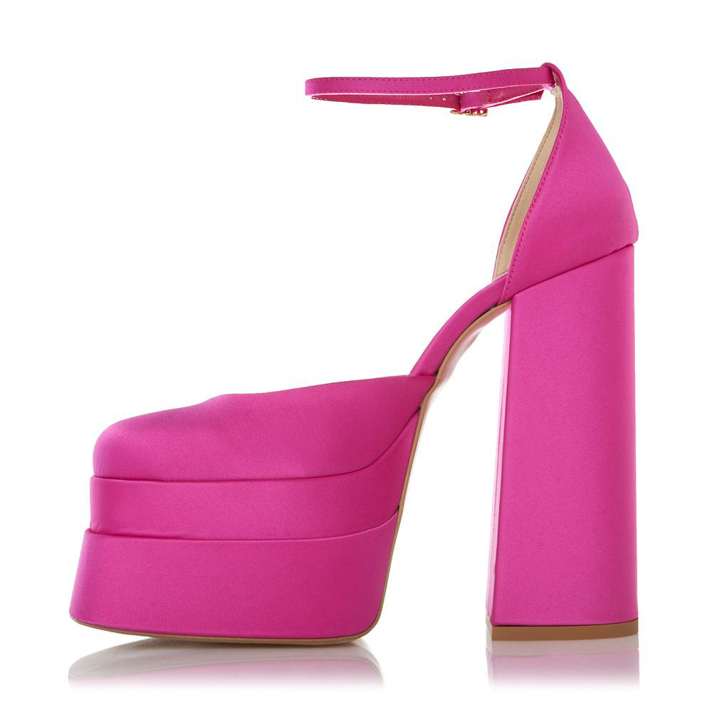 Chic Fuchsia Satin Square Toe Chunky High Heel Platform Pumps