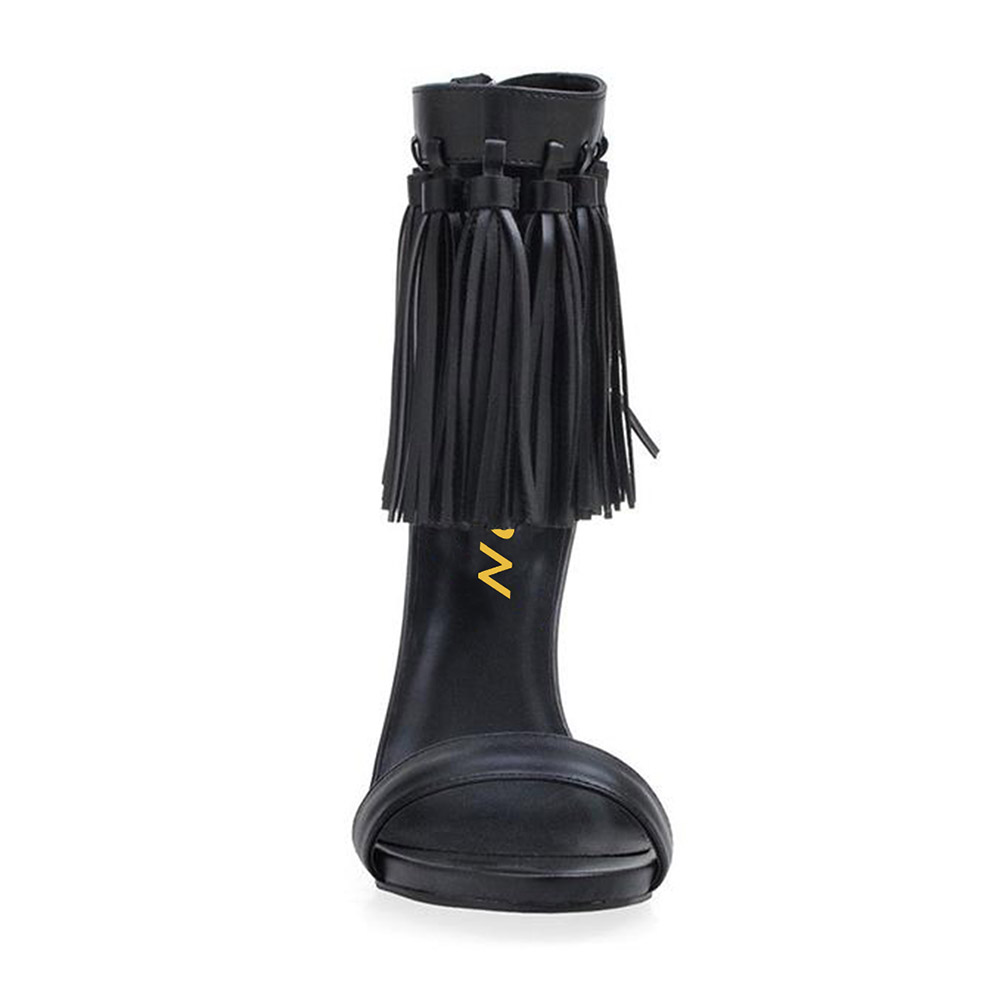 Chic Open Round Toe Tassel Decor Back Zipper Black Heels Sandals