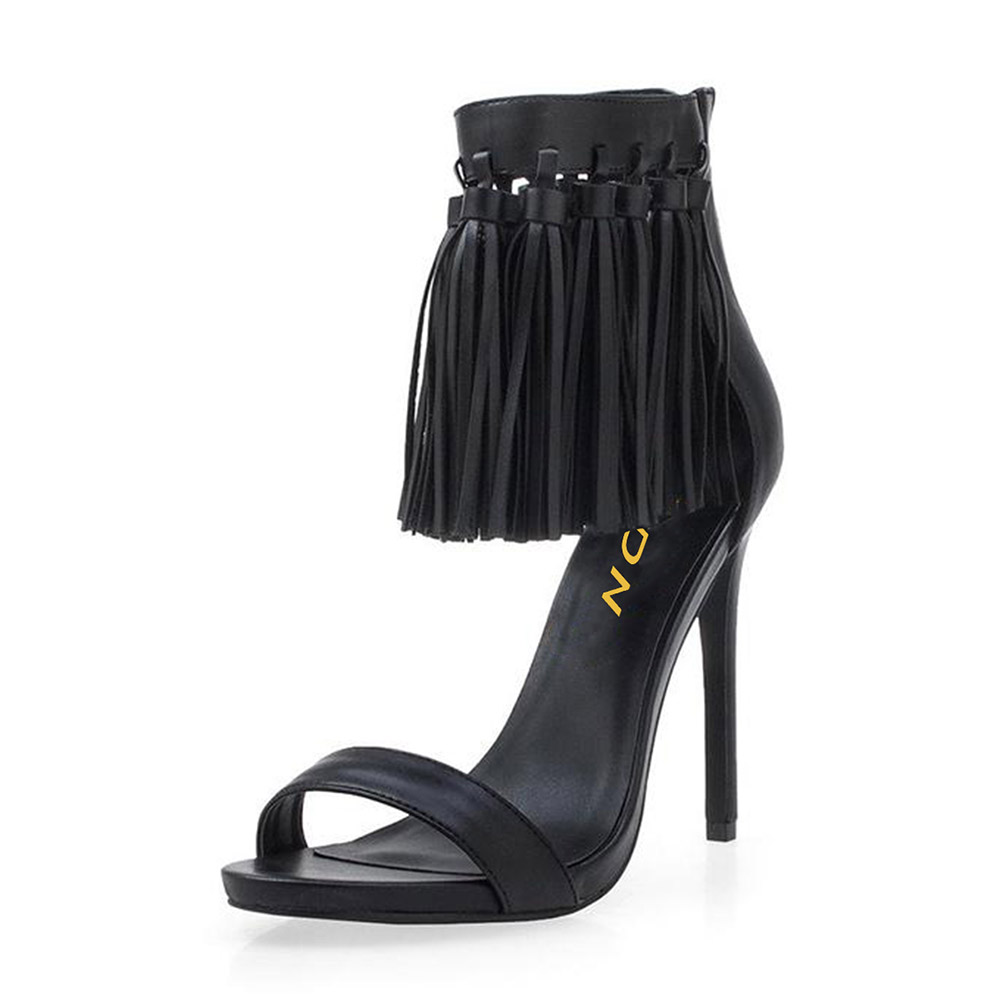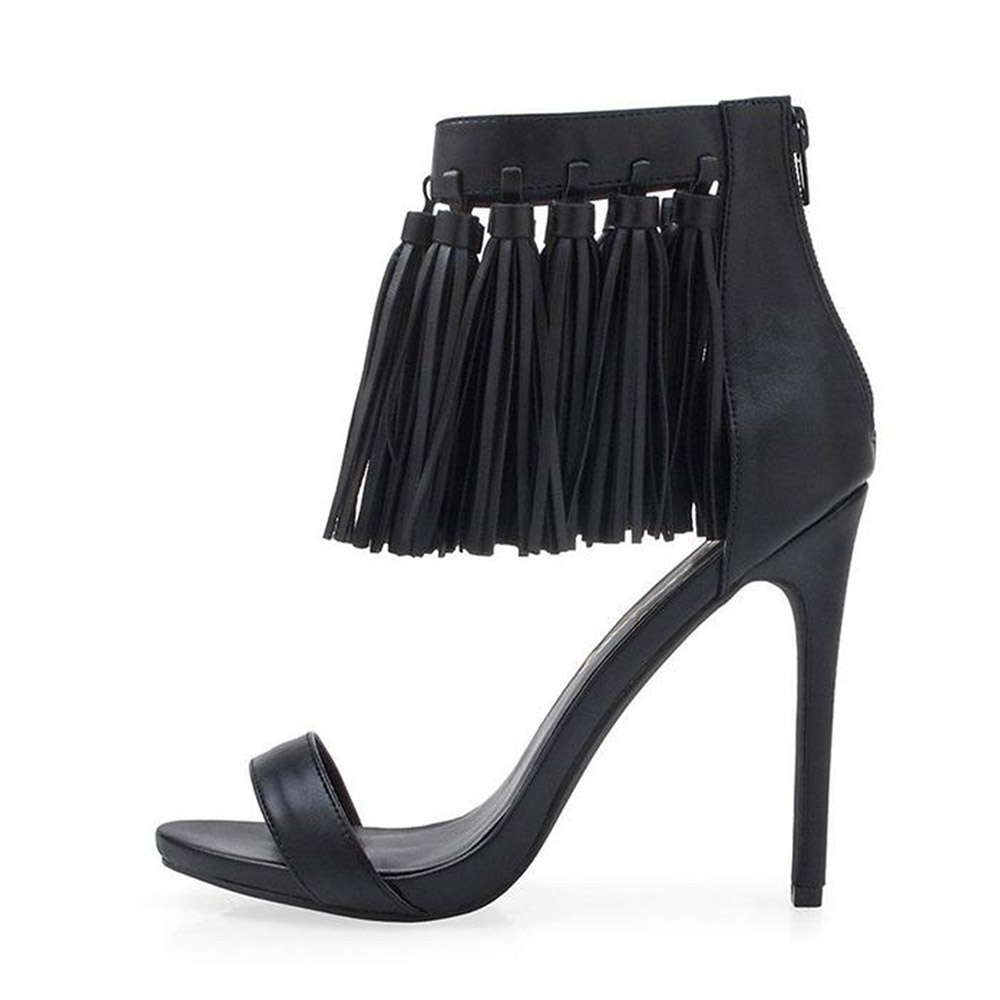 Special Designs: The open-toe black heels sandals feature a tassel decor ankle strap and a back zipper.