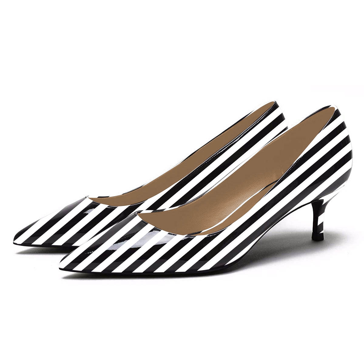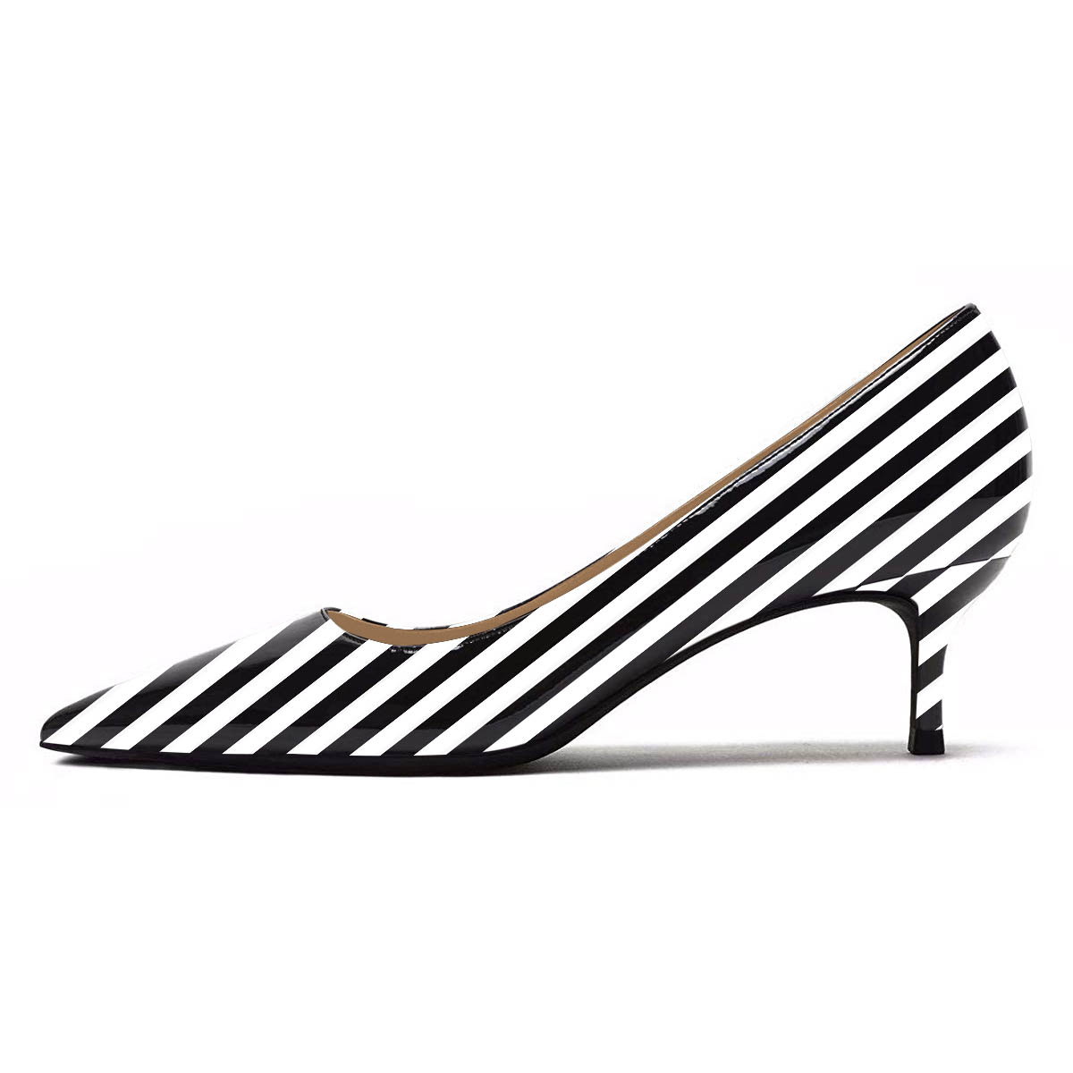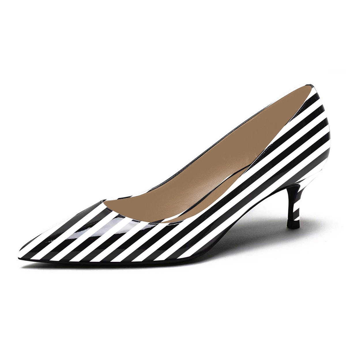 • Special Designs: The pointed-toe pump shoes feature a chic white and black stripe and an elegant kitten heel.