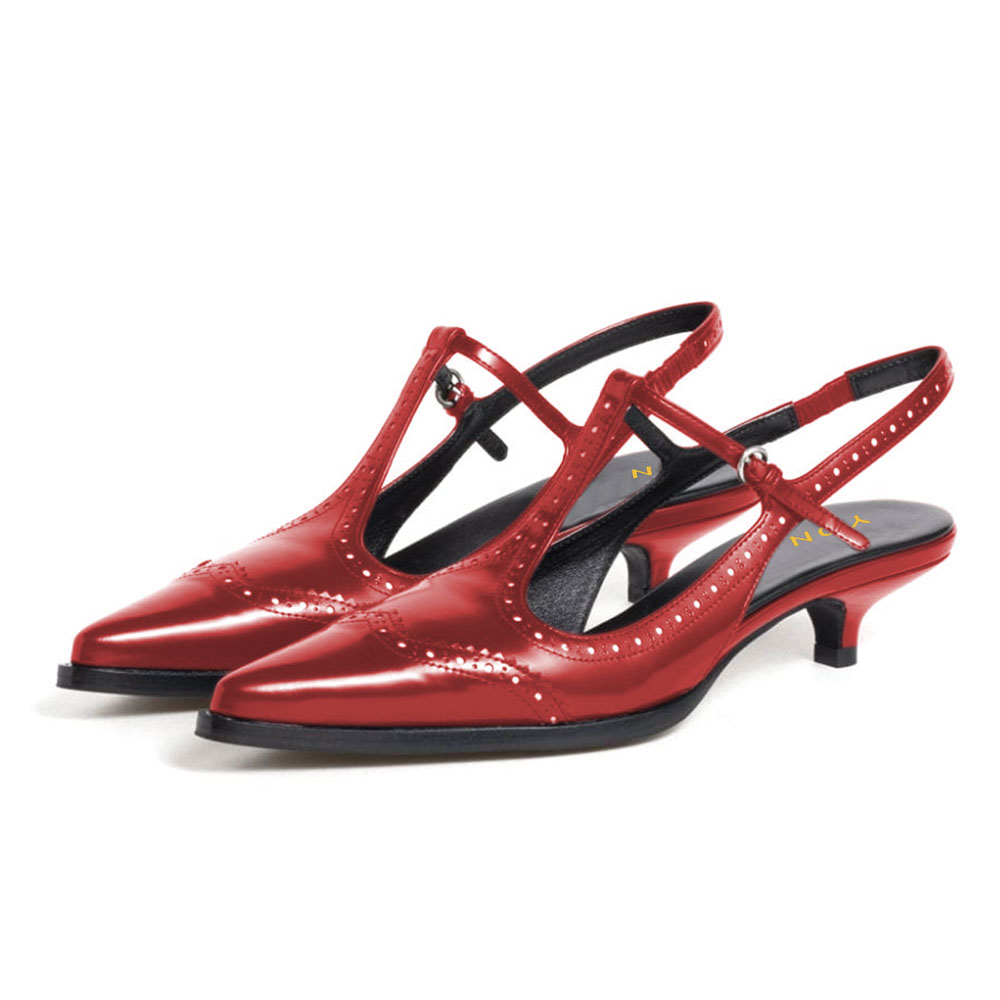 • Special Designs: The pointed-toe slingback shoes feature kitten heels and a buckled T-strap.