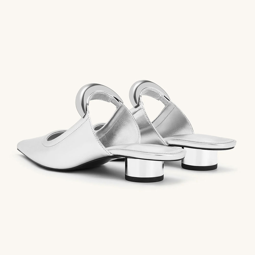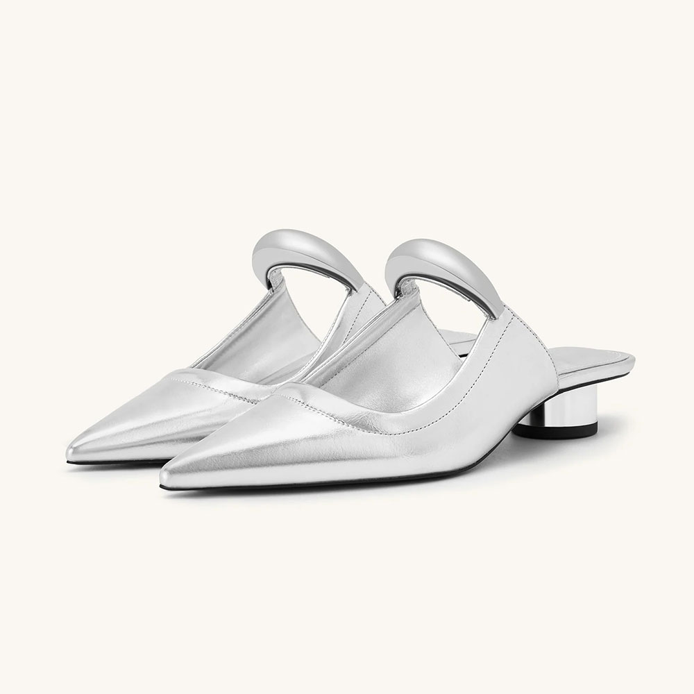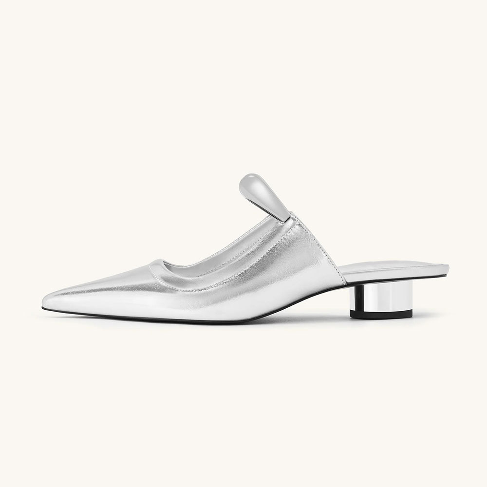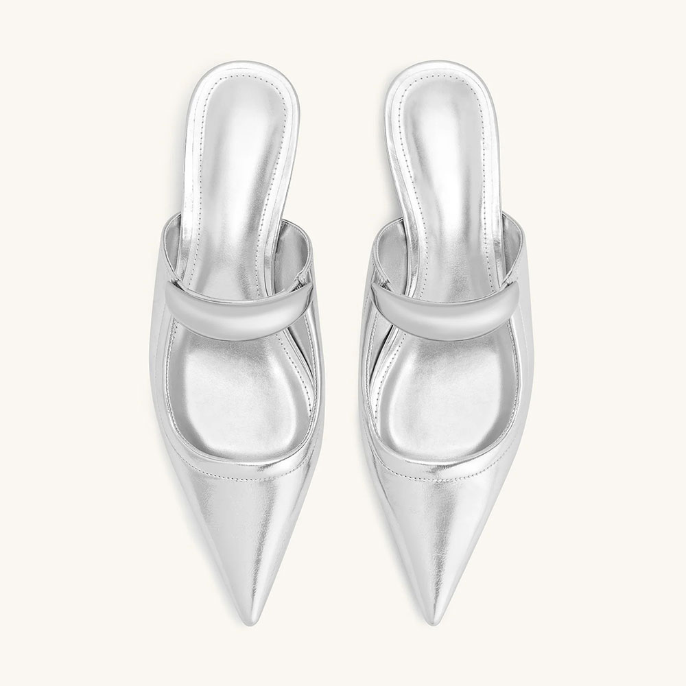 • Special Designs: These silver mules feature a pointed toe, a cylinder heel, and a unique silver metal strap across the vamp.