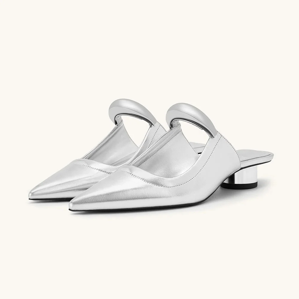 Chic Silver Metallic Cylinder Heel Slip On Metal Strap Pointy Toe Mules