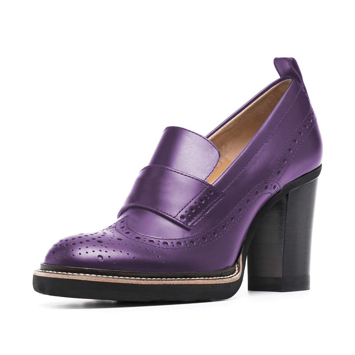 Chic Vegan Leather Round Toe Perforated Loafer Heels in Purple