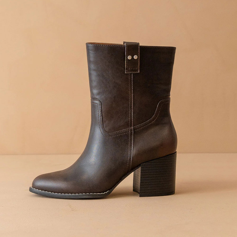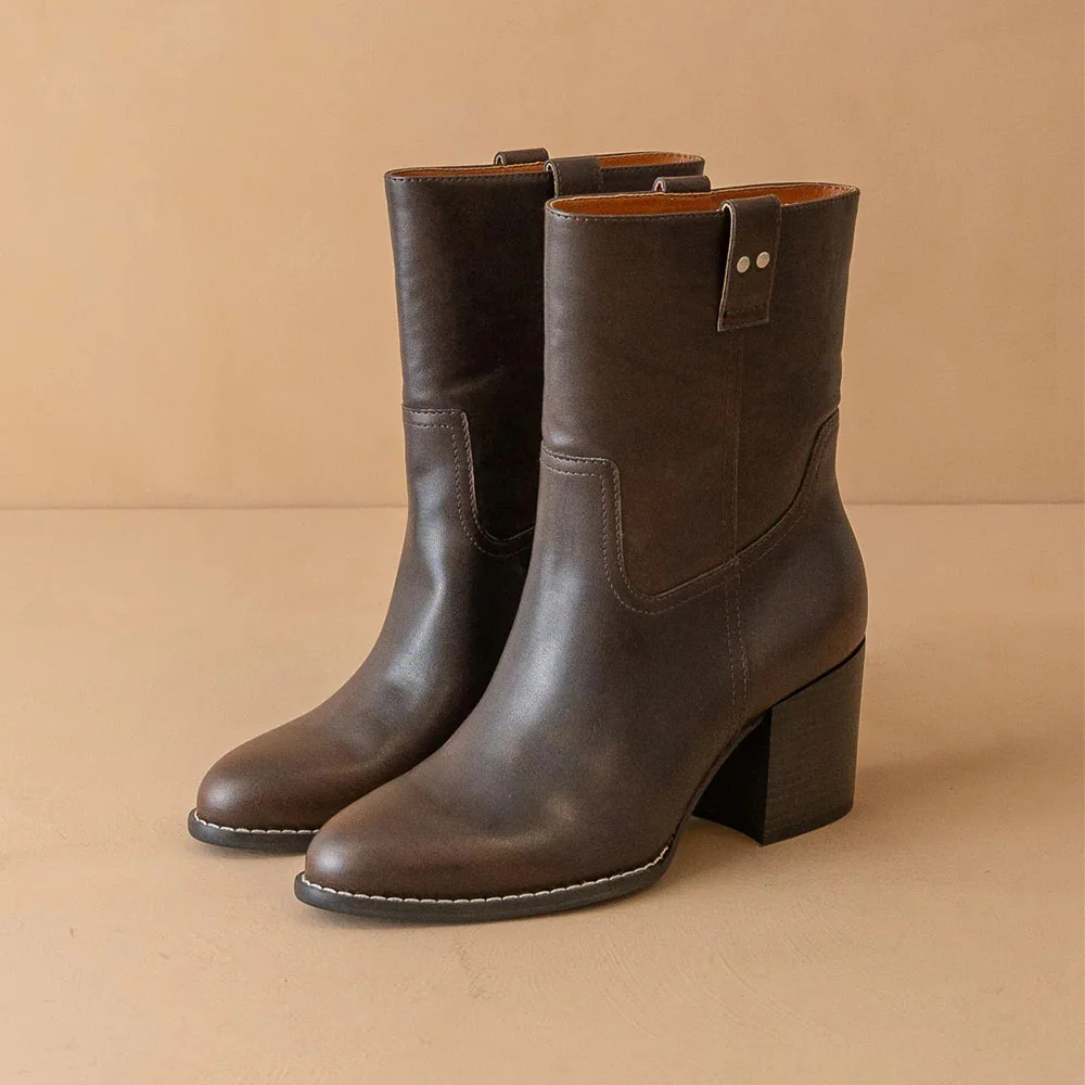 Chocolate Brown Mid Block Heel Round Toe Pull On Ankle Boots for Women