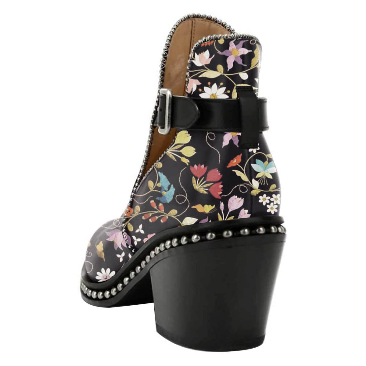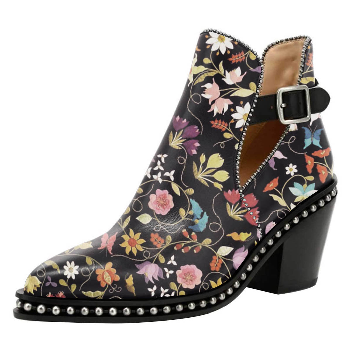 Chunky Heel Studded Pointed Toe Flower Print Buckle Strap Ankle Boots