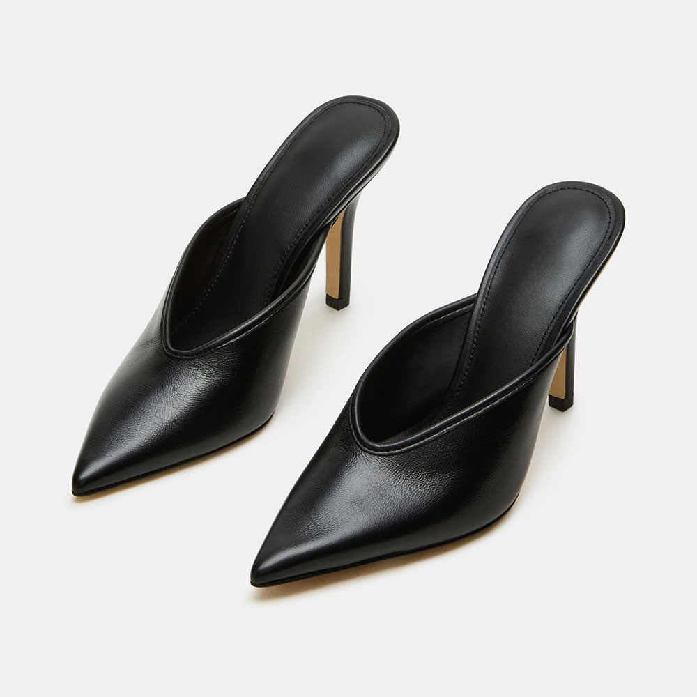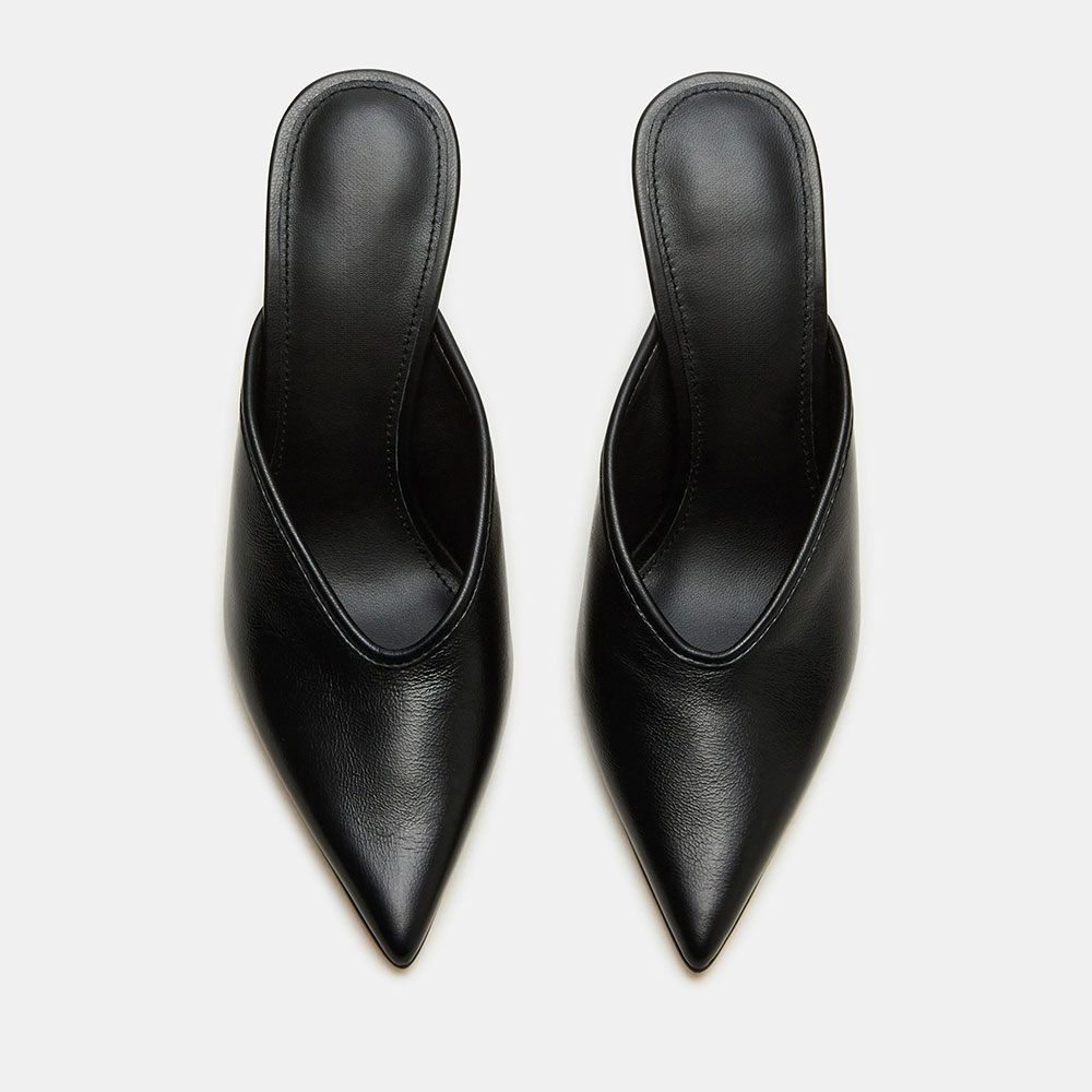 Classic Black Vegan Leather Pointed Toe Stiletto Heeled Mules