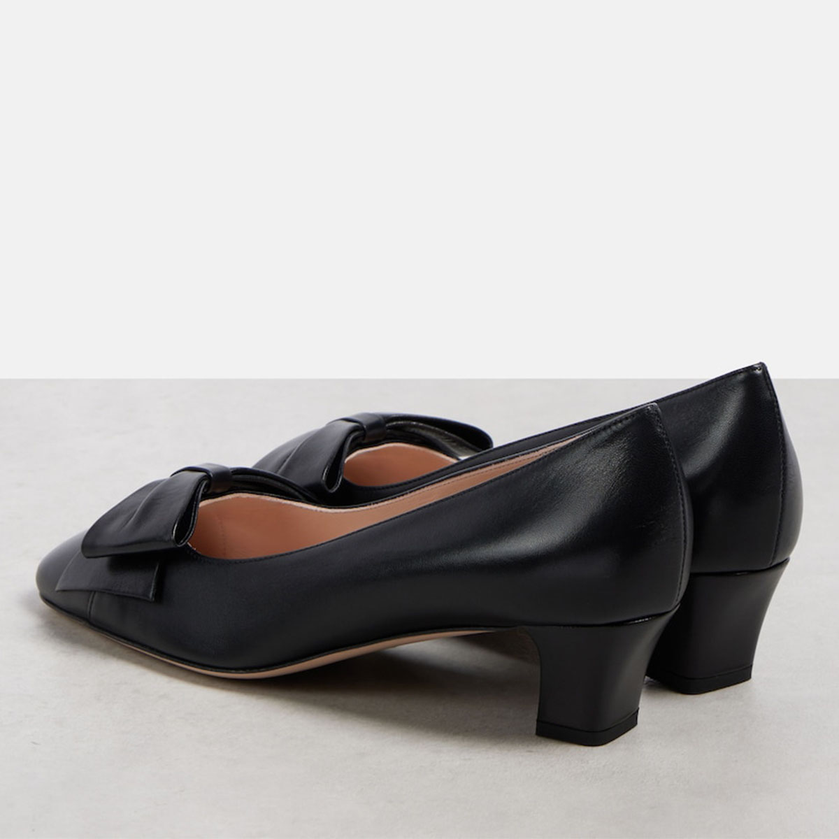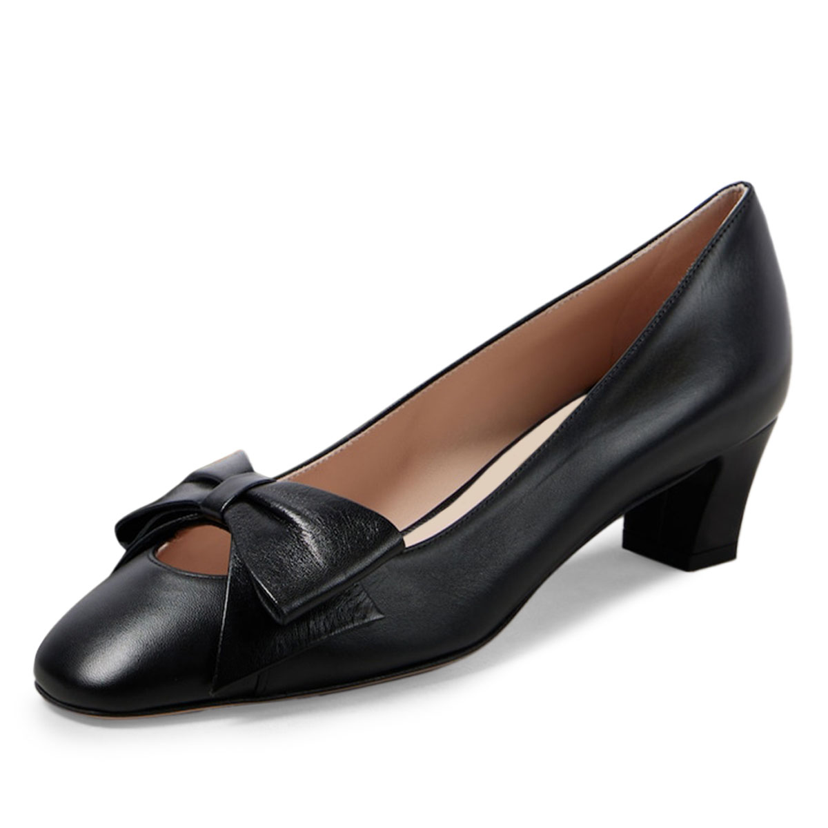 Classic Black Vegan Leather Square Toe Bow Chunky Heel Pumps for Women