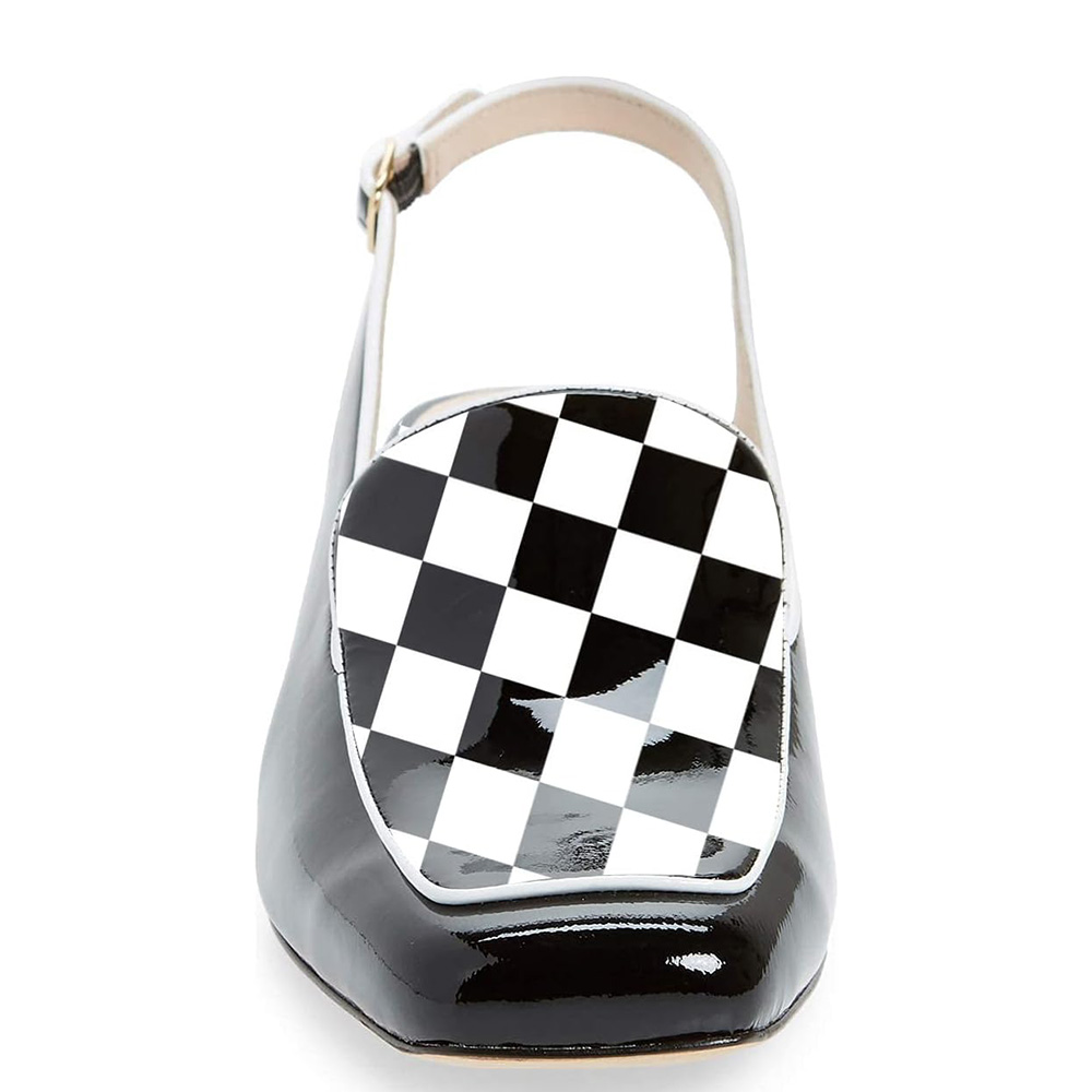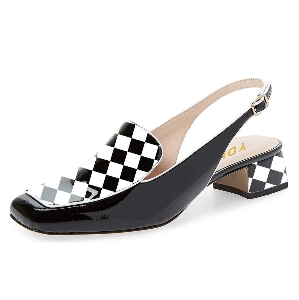 Classic Black & White Checkered Patent Leather Slingback Loafer Heels