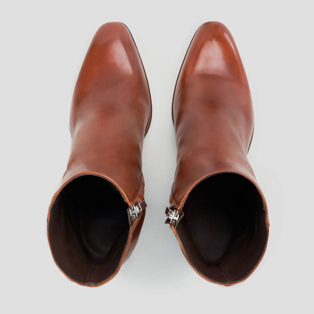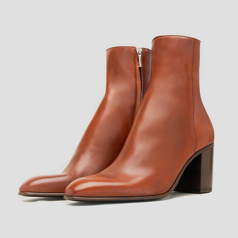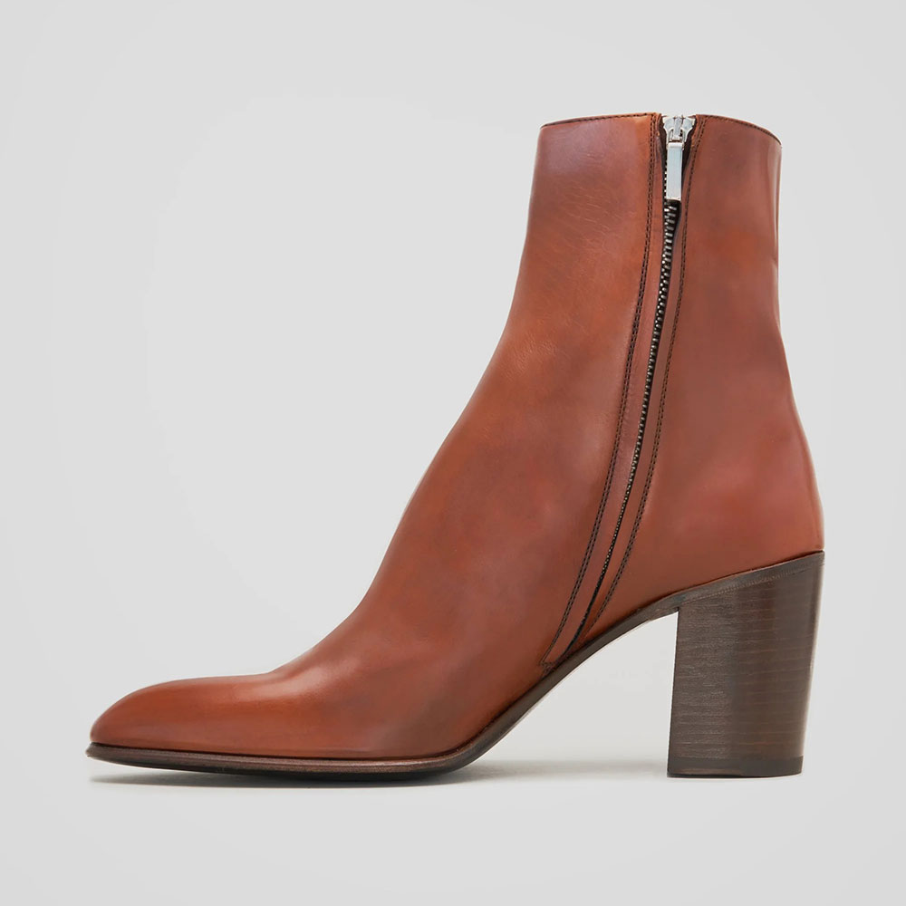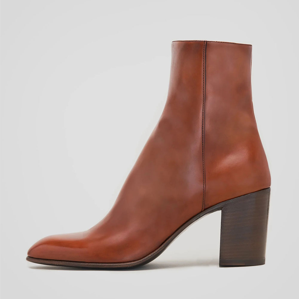 Special Designs: The ankle boots feature a chunky heel, a classic brown color, a side zipper, and an almond-toe design.