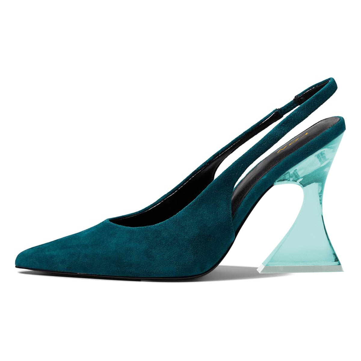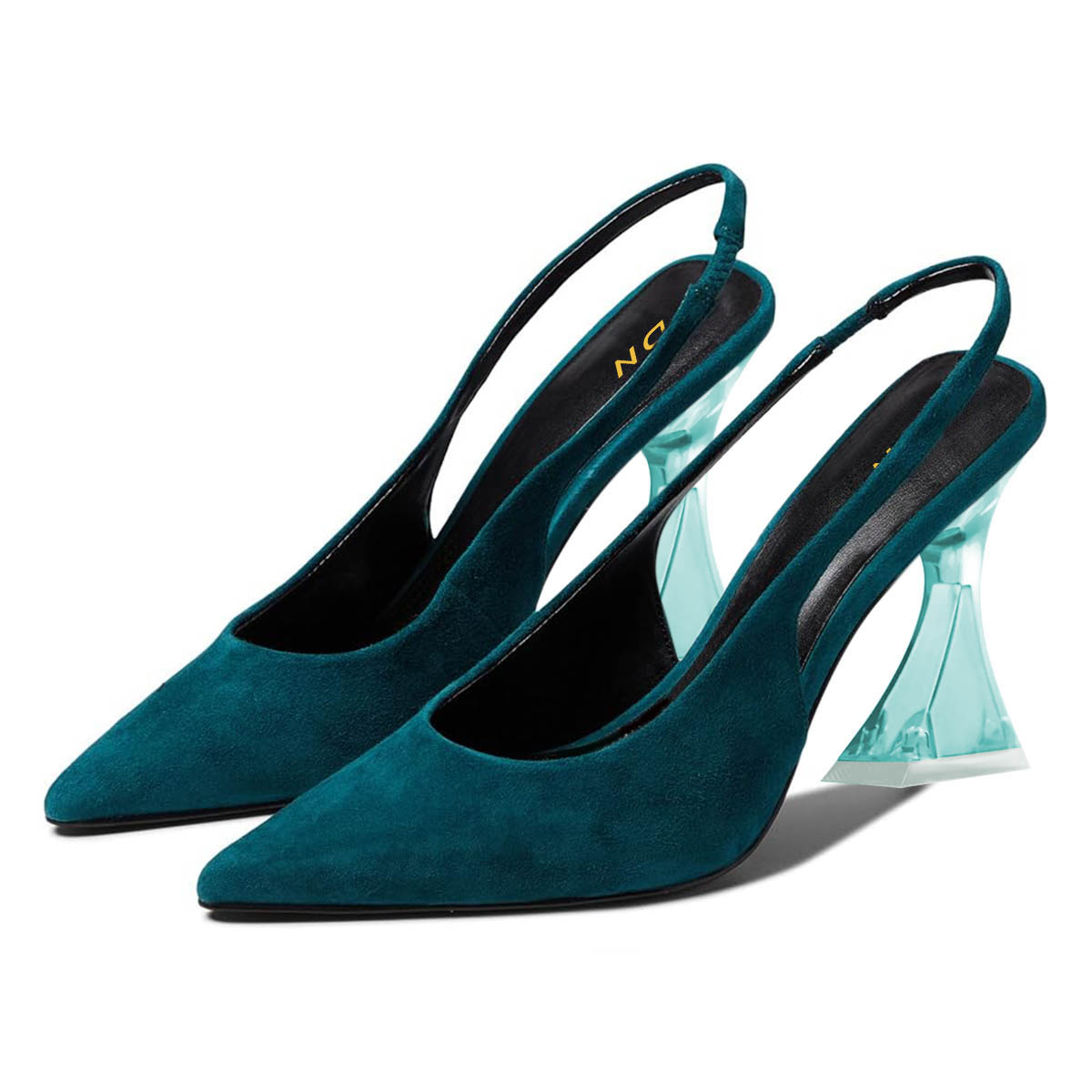 Special Designs: The pointed-toe slingback heels feature a green transparent flared heel.