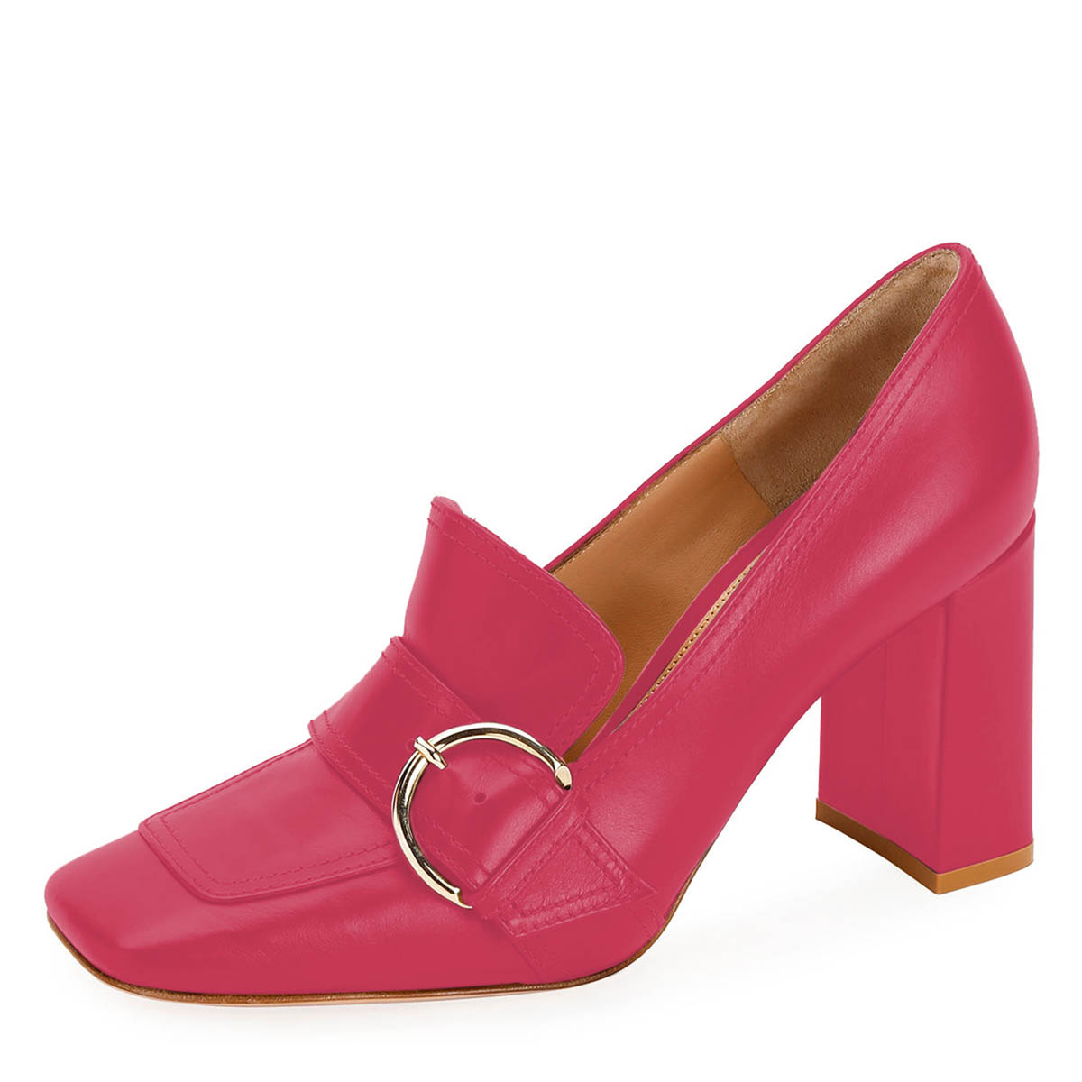 Classic Magenta Vegan Leather Buckle Loafer Heels with Square Toe