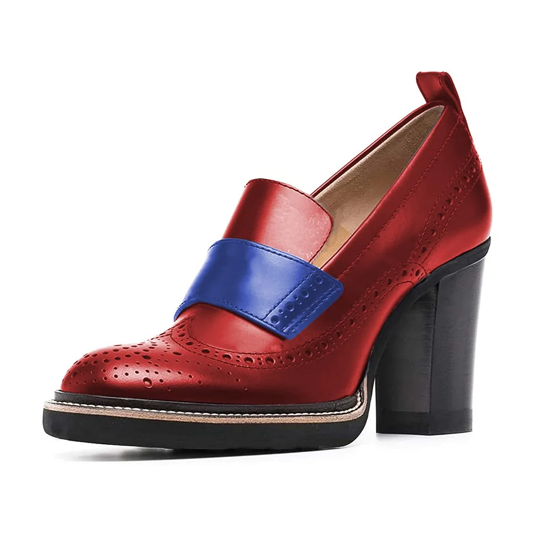 Classic Red Round Toe Chunky Heeled Loafers with Perforated
