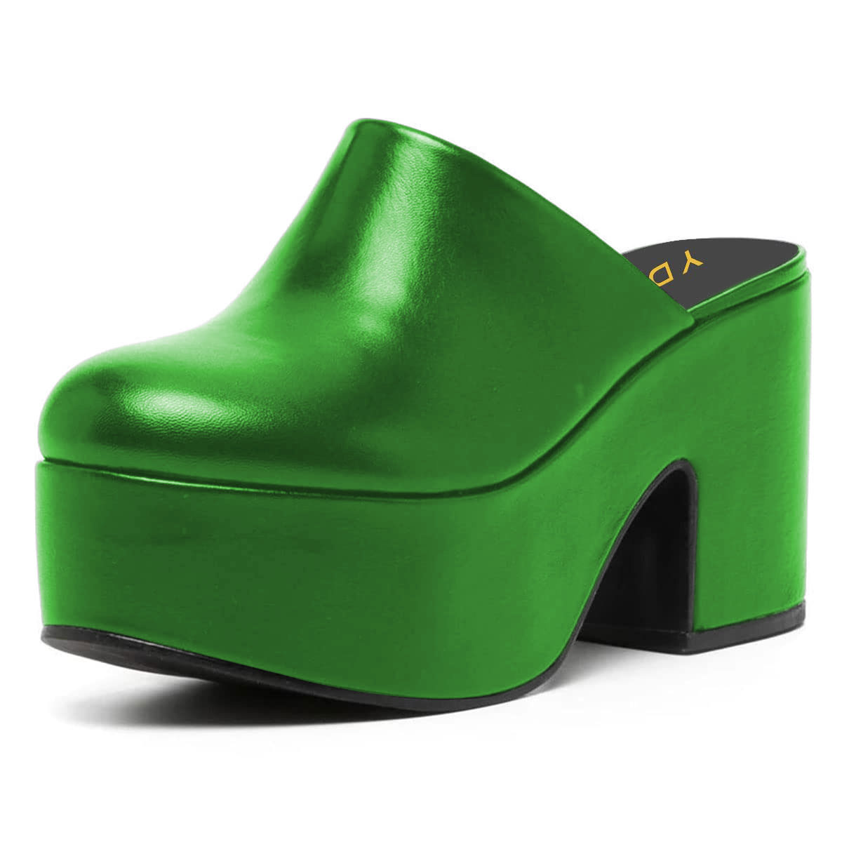Classic Vegan Leather Round Toe Platform Block Heeled Mules in Green