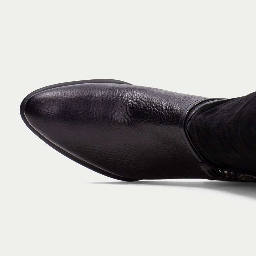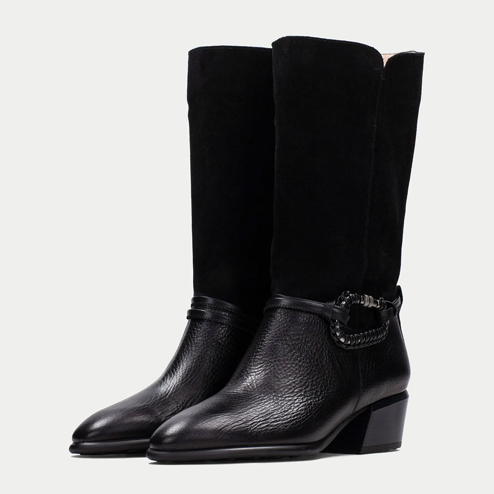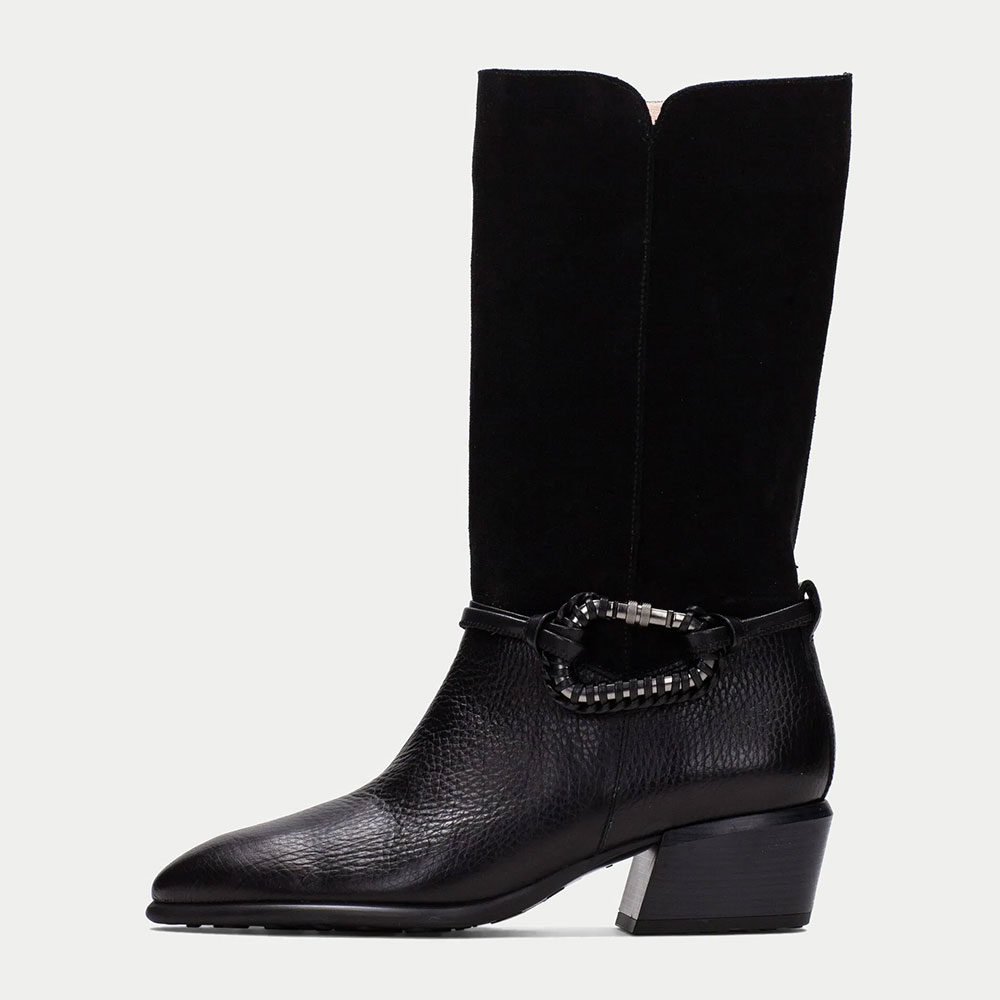 • Special Designs: The cowgirl boots have a silver spring buckle, a mid-calf design, and a closed-toe.