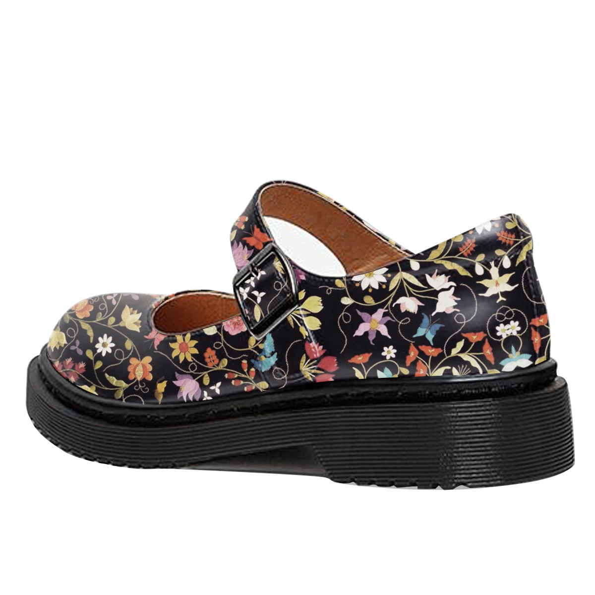 Colorful Floral Printed Vegan Leather Round Toe Black Mary Janes