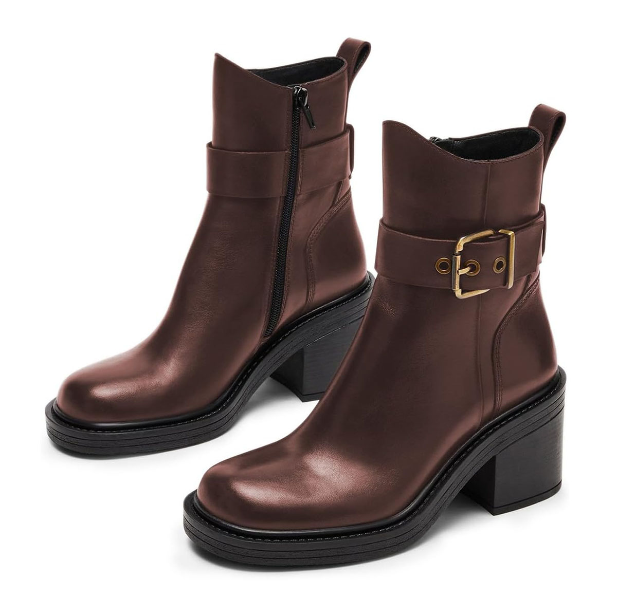 Special Designs: Brown ankle boots with classic block heel, buckle inlay and side-zip closure