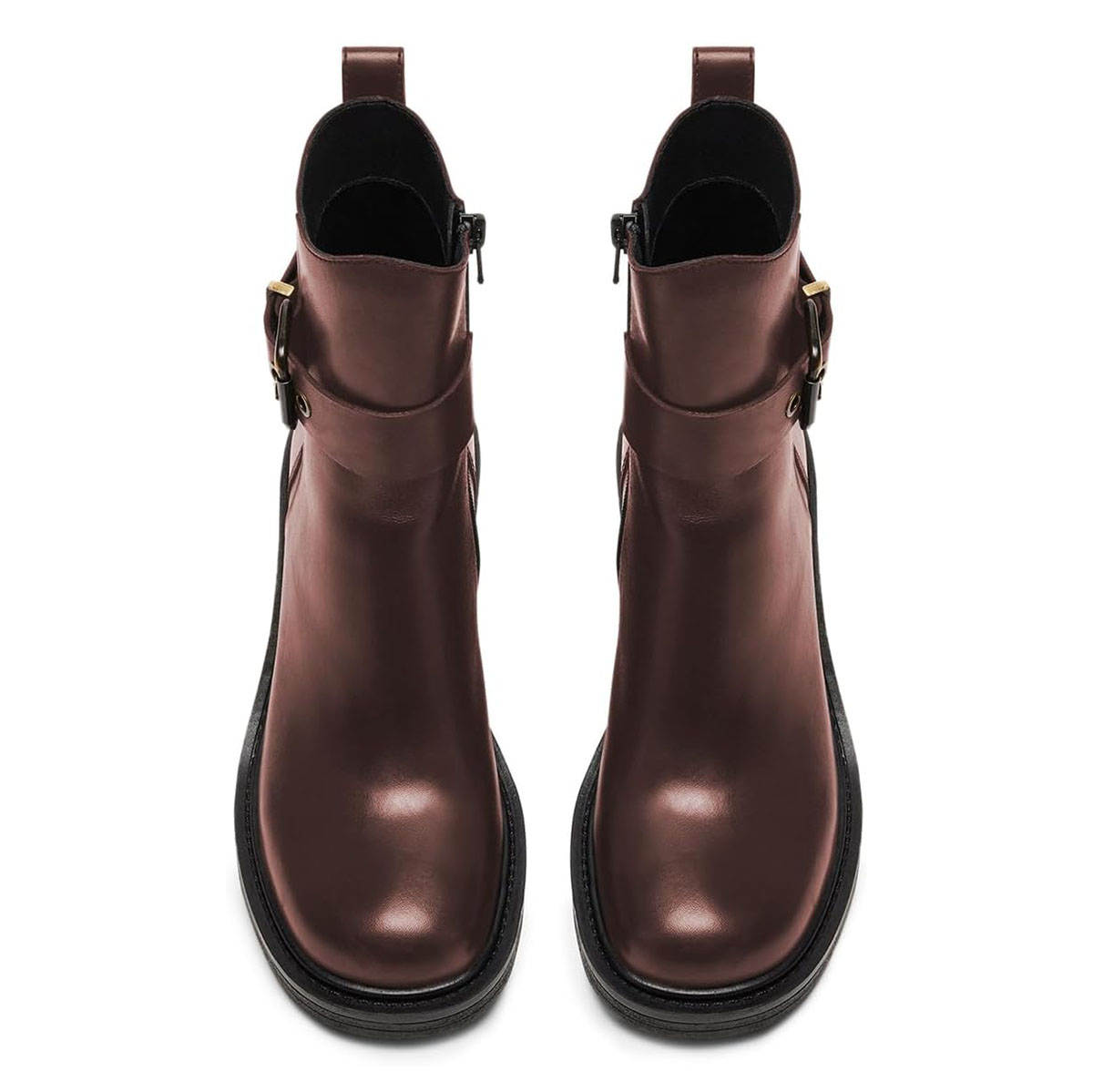 Dark Brown Vegan Leather Round Toe Buckle Inlay Block Heel Ankle Boots