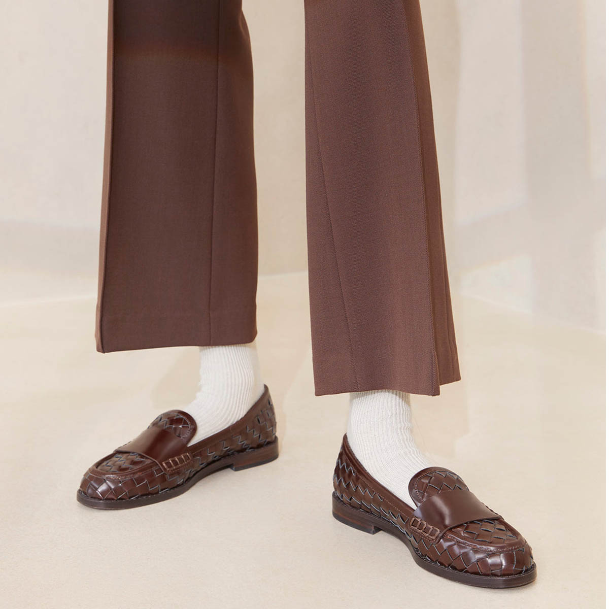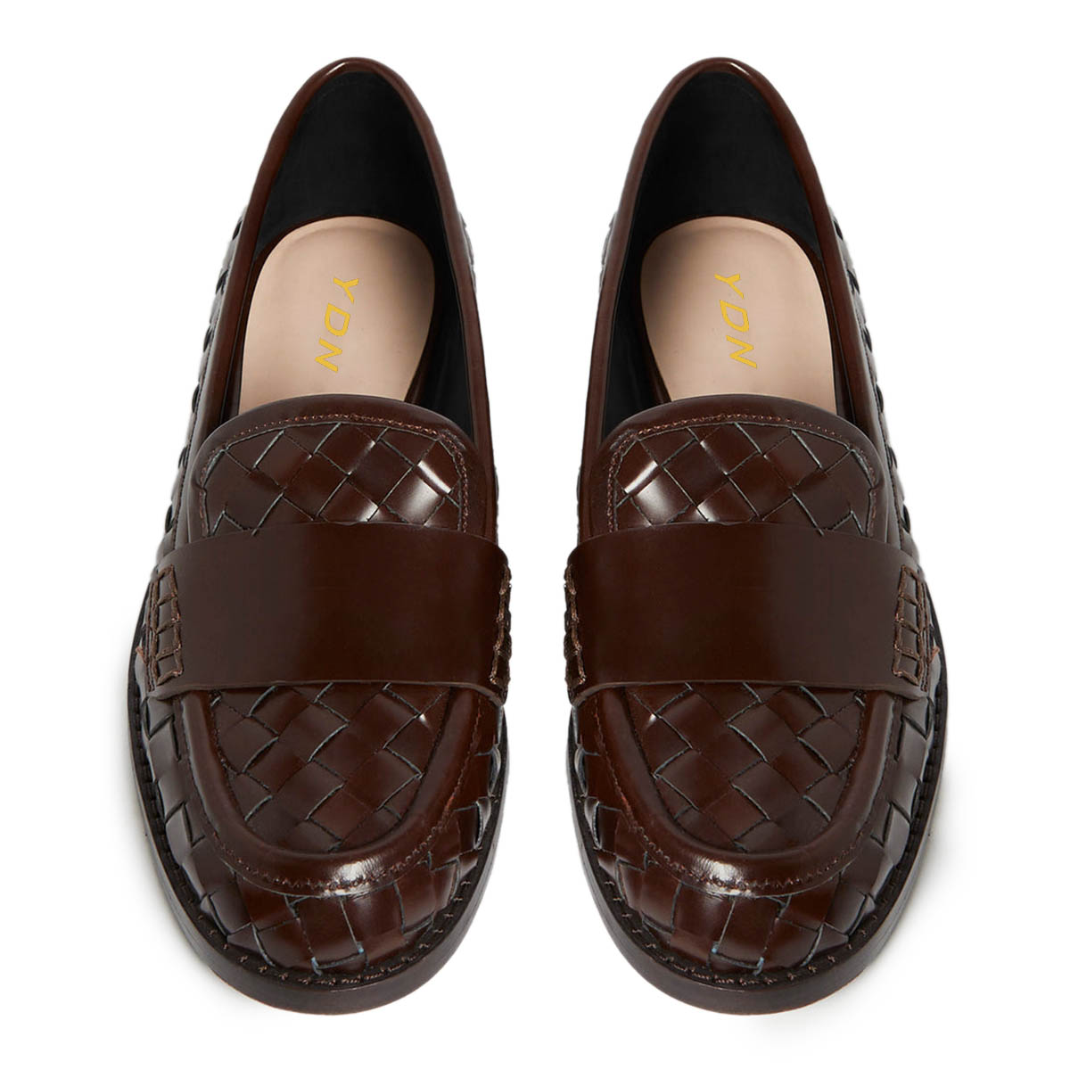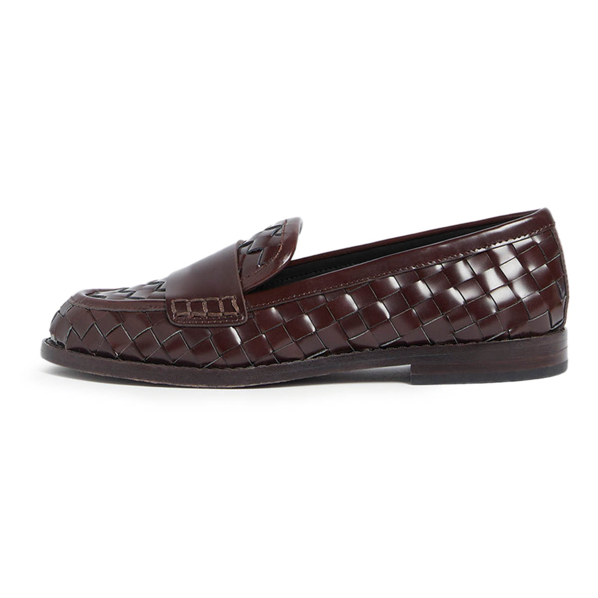 • Special Designs: Dark brown loafers faturing woven inlay and slip-on convinience