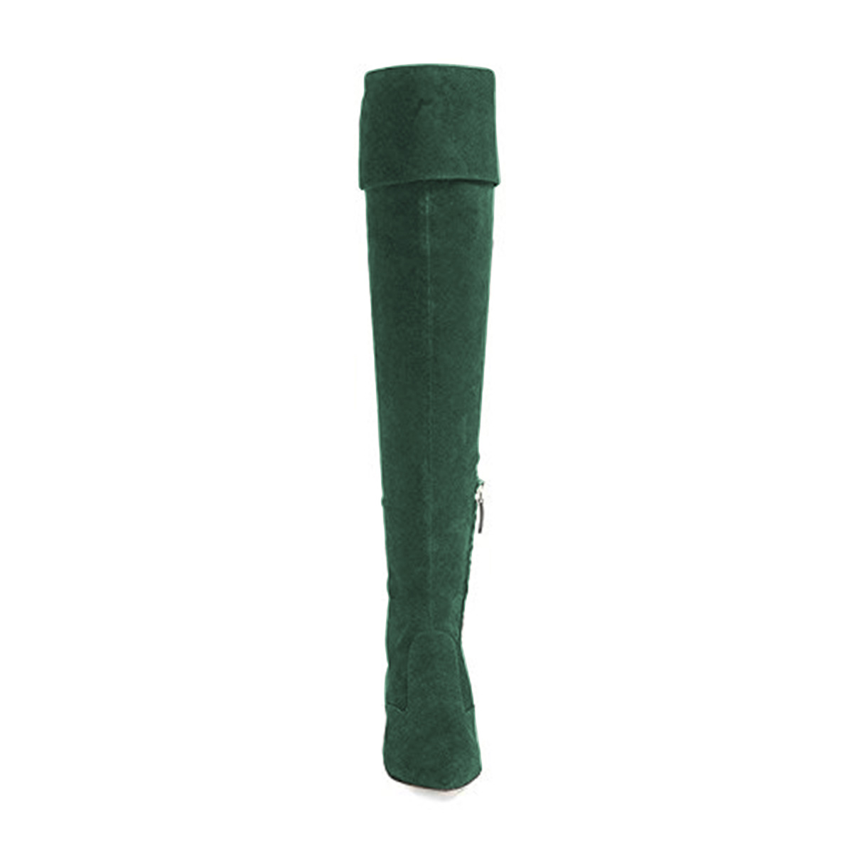 • Special Designs: Green over-the-knee boots with faux suede sophistication, side-zip closure and a classic kitten heel.