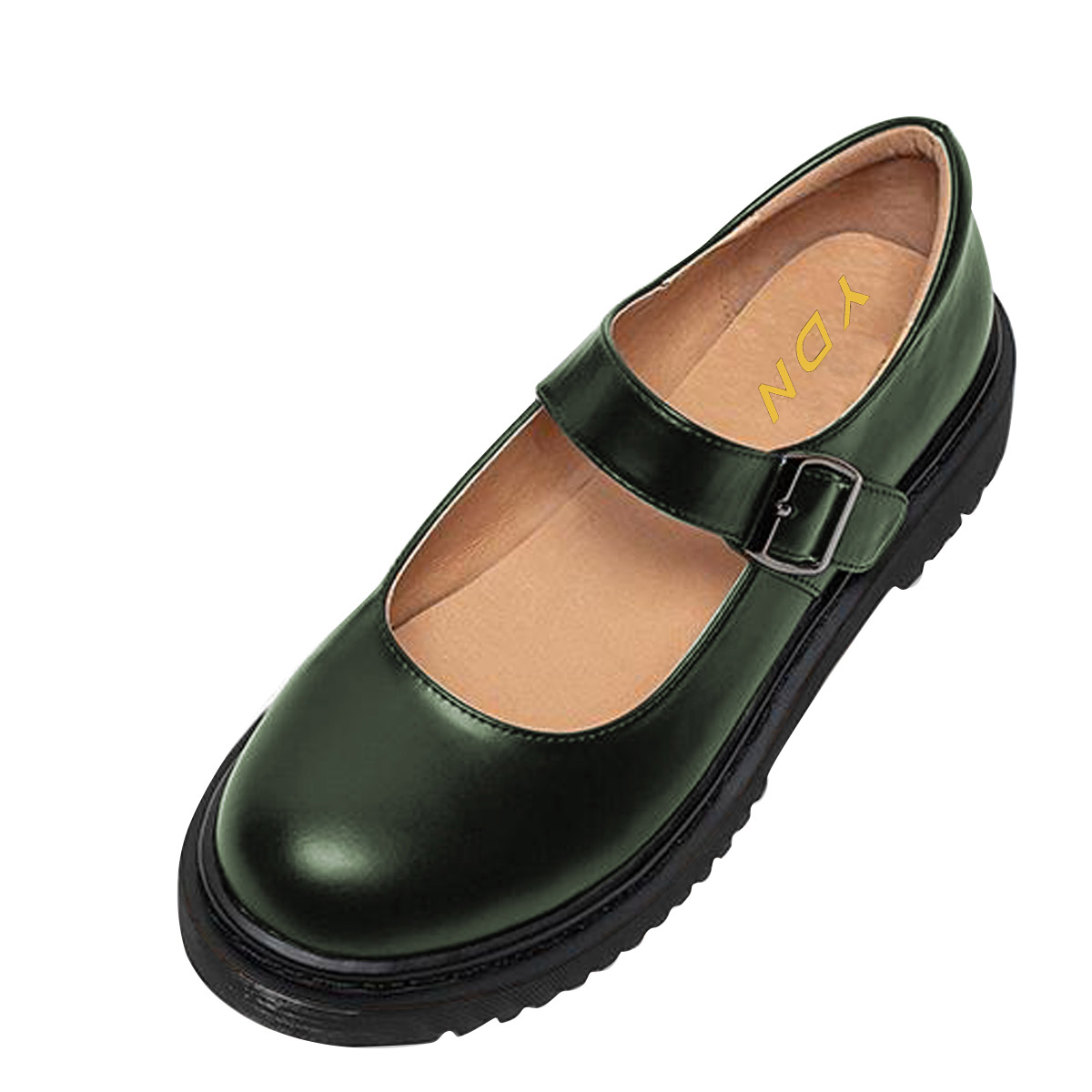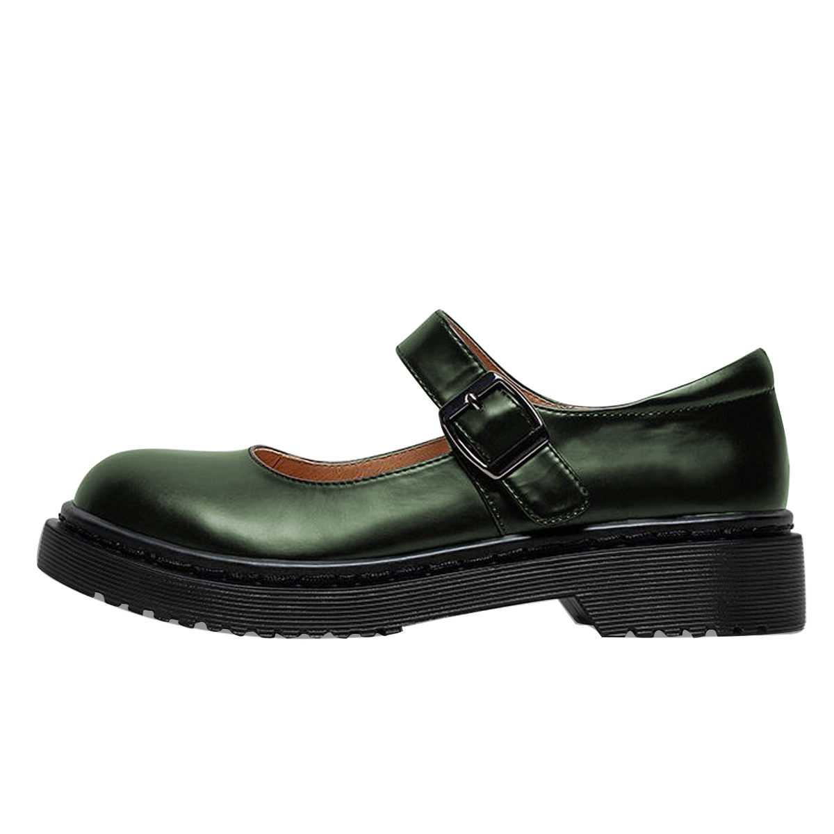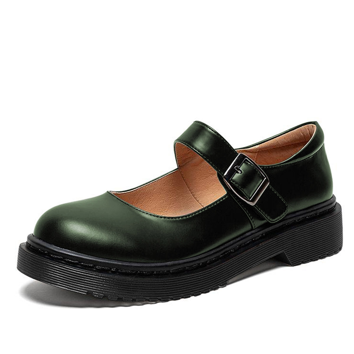 Dark Green Vegan Leather Round Toe Mary Jane Shoes with Bold Platform