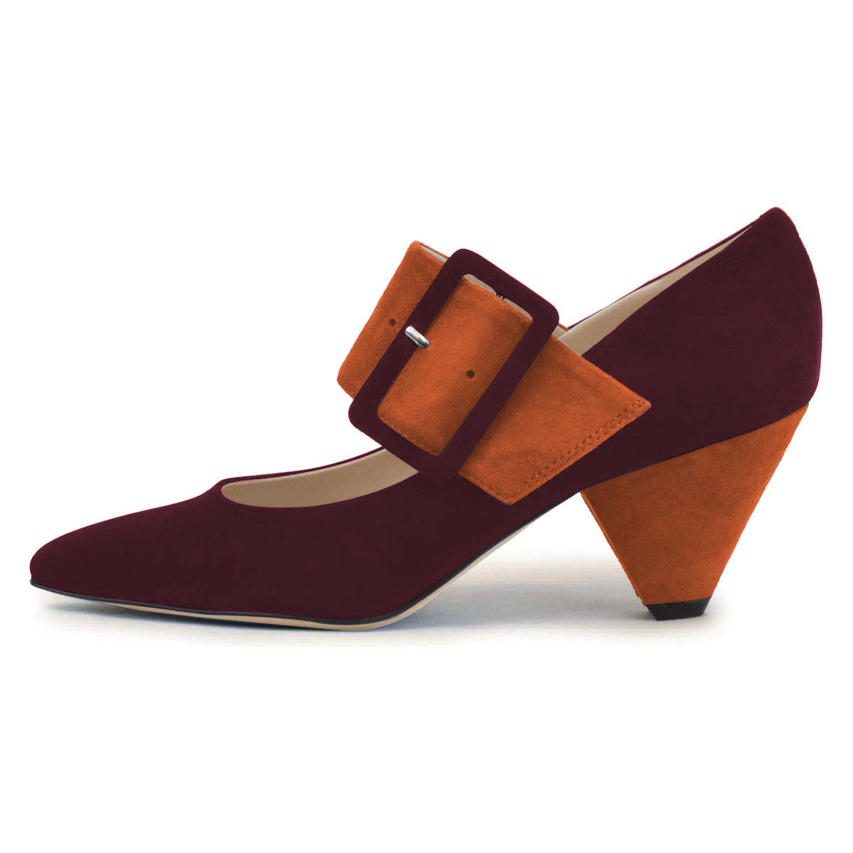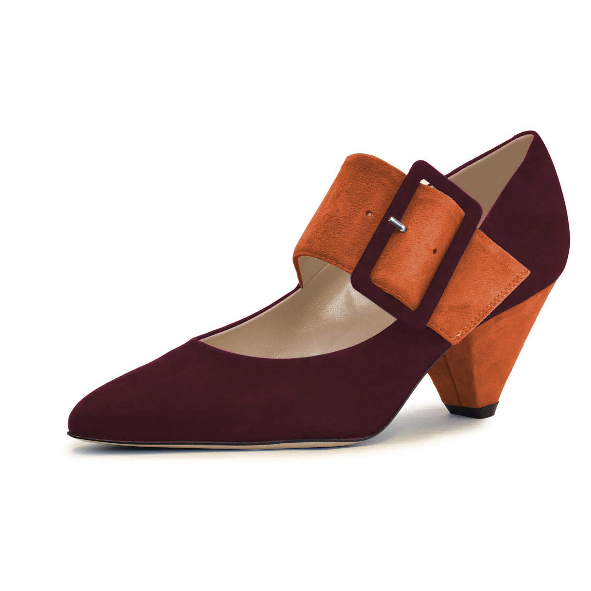 • Special Designs: Dark red pumps with faux suede sophistication and a buckle fastening orange wide strap design