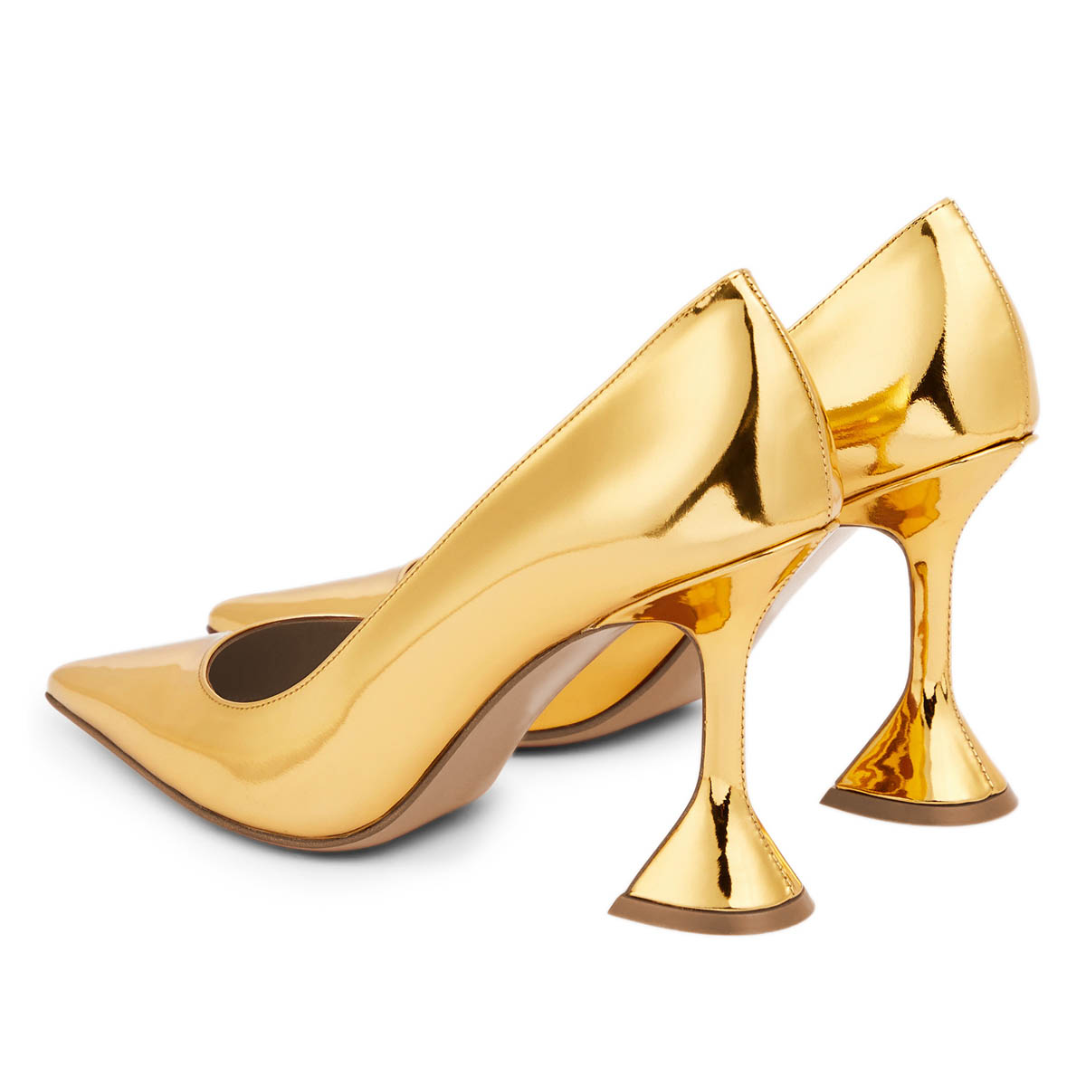 • Special Designs: The gold pumps feature flared heels and a pointed-toe design.