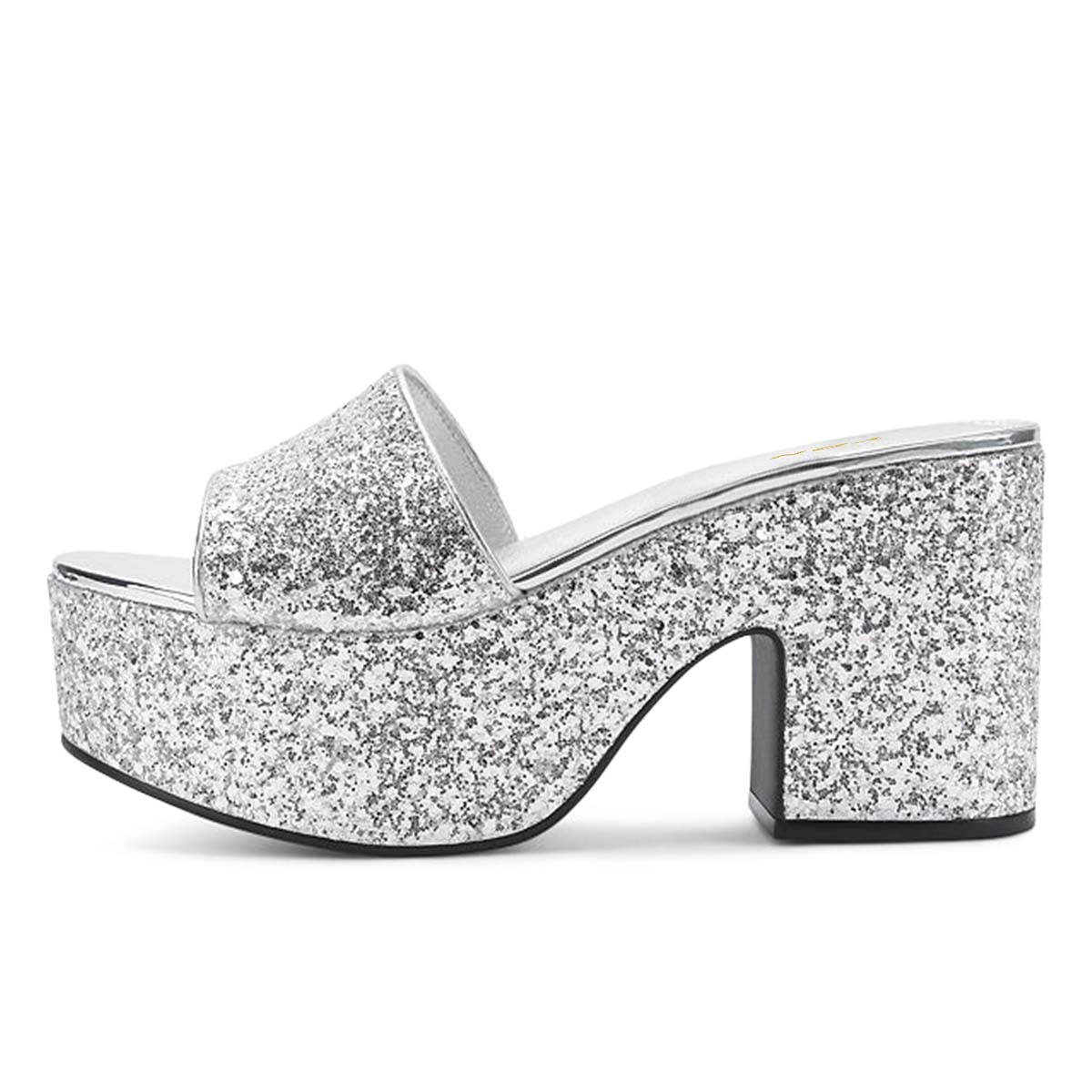 • Special Designs: The open-toe platform slide sandals feature chunky heels and a dazzling glitter finish.