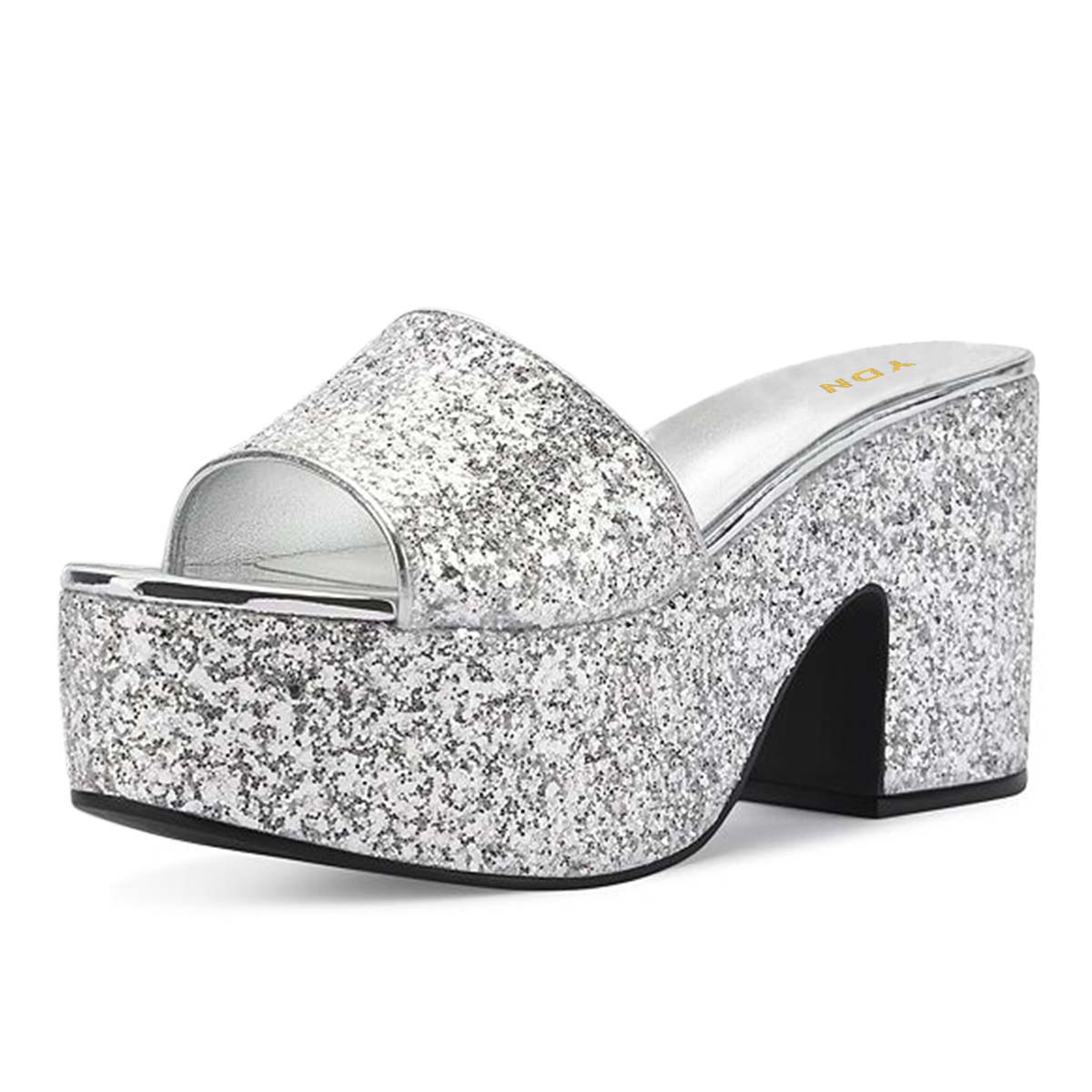 Dazzling Silver Glitter Open Toe Chunky Heel Platform Slide Sandals