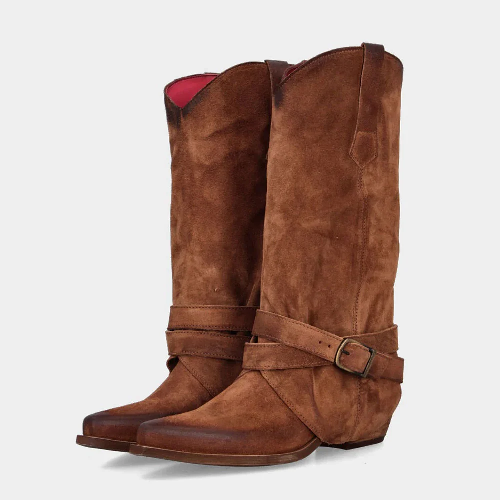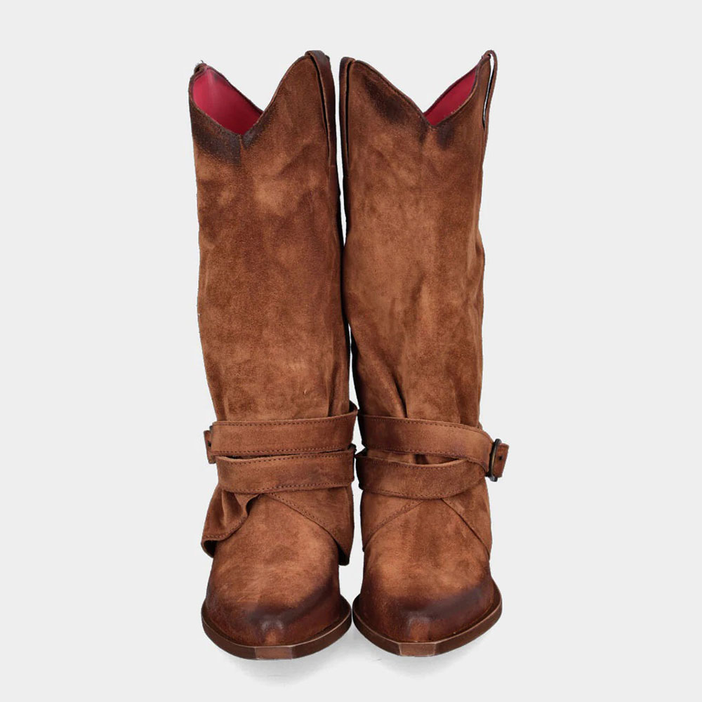 Distressed Brown Block Heel Fold Over Buckled Western Boots for Women