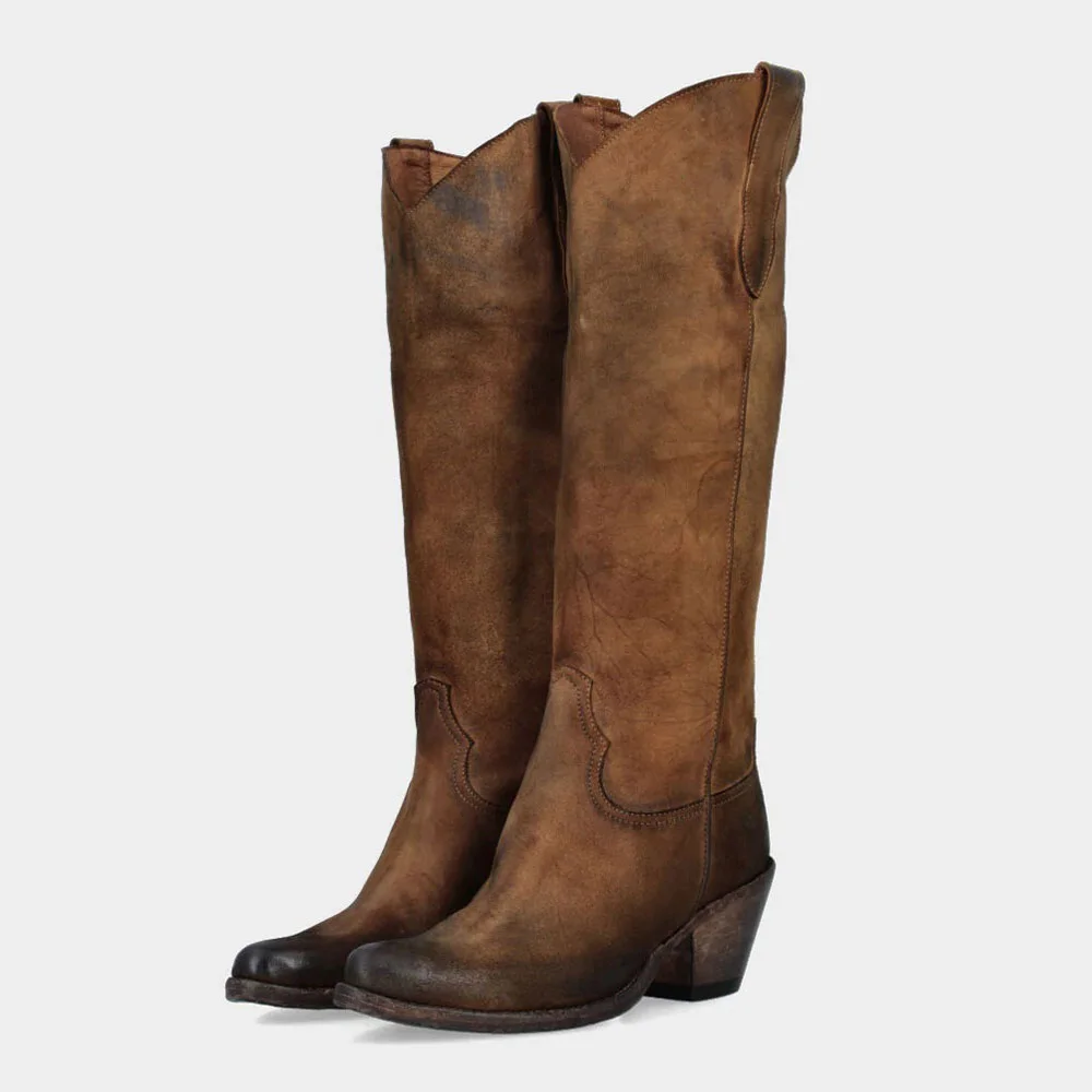 • Special Designs: The cowgirl boots have a snip toe, a distressed style, a mid-block heel, and a long calf design.