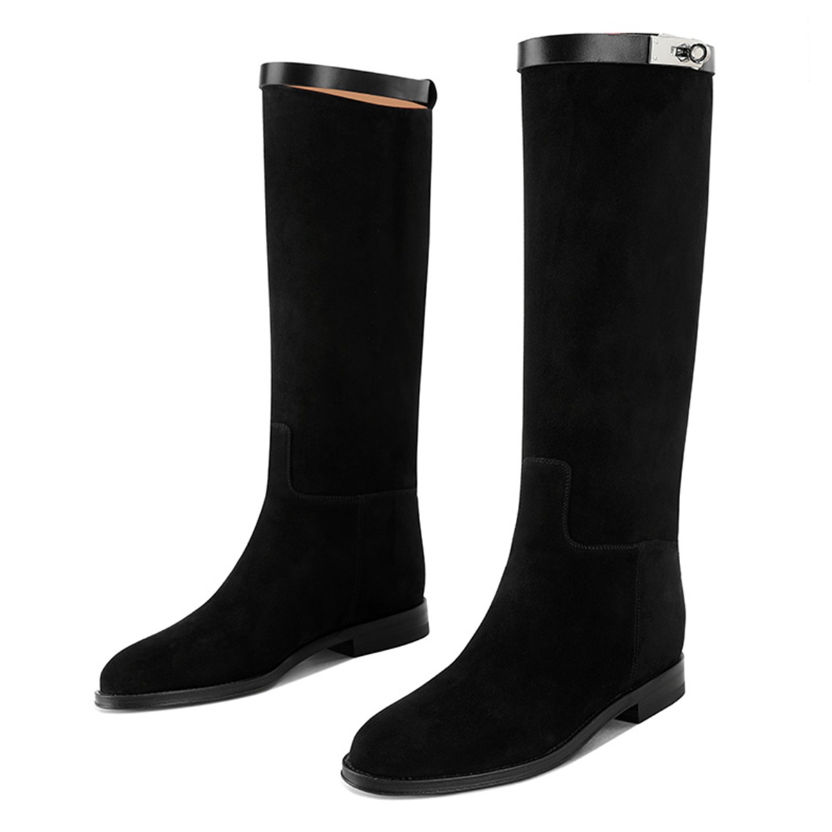 Special Designs: The flat boots feature an elegant black color, a round toe, an iconic silver buckle, and a slip-on design.