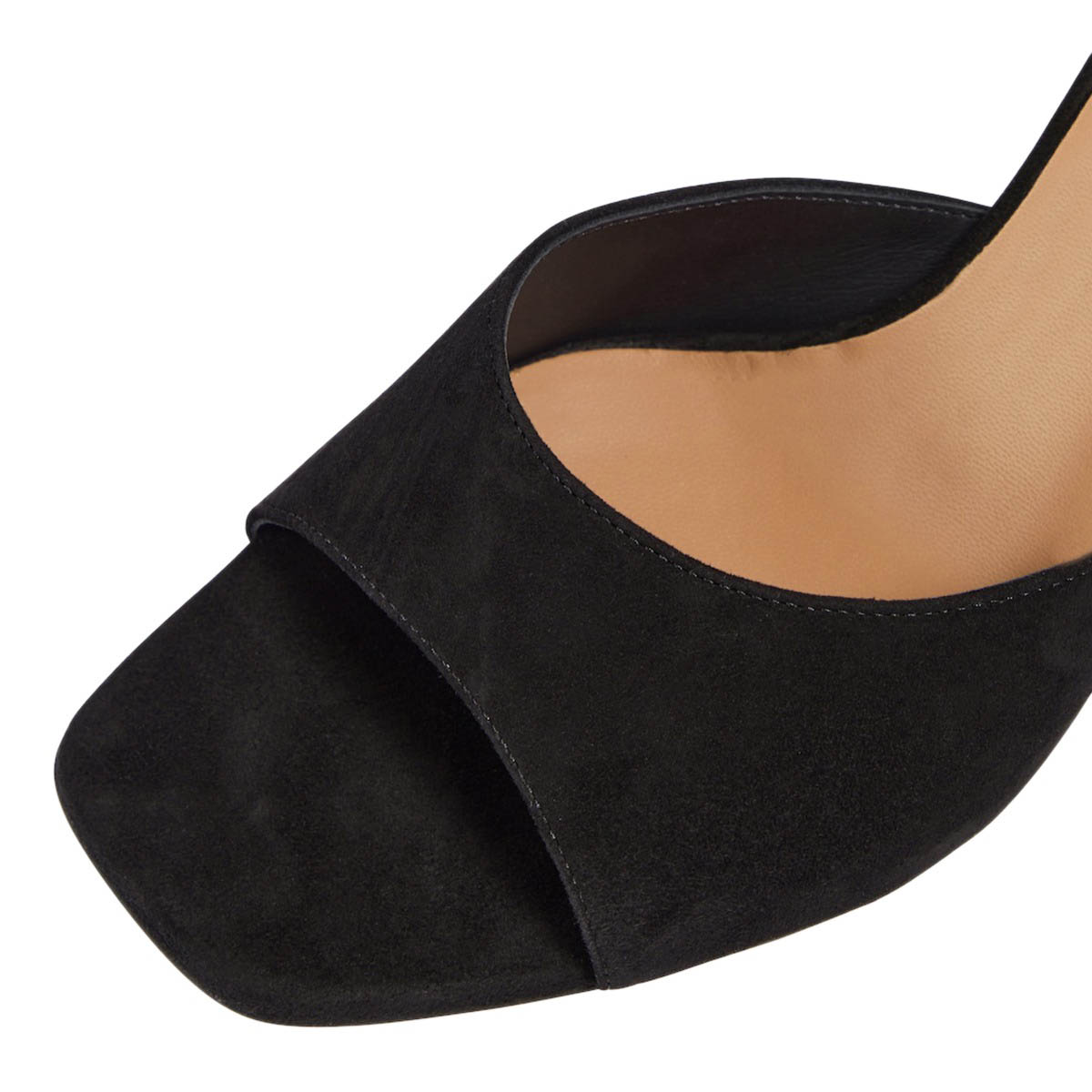 Special Designs: The black square-toe heeled mules feature sculptural heels adorned with sparkling rhinestones and a slip-on design for convenience.