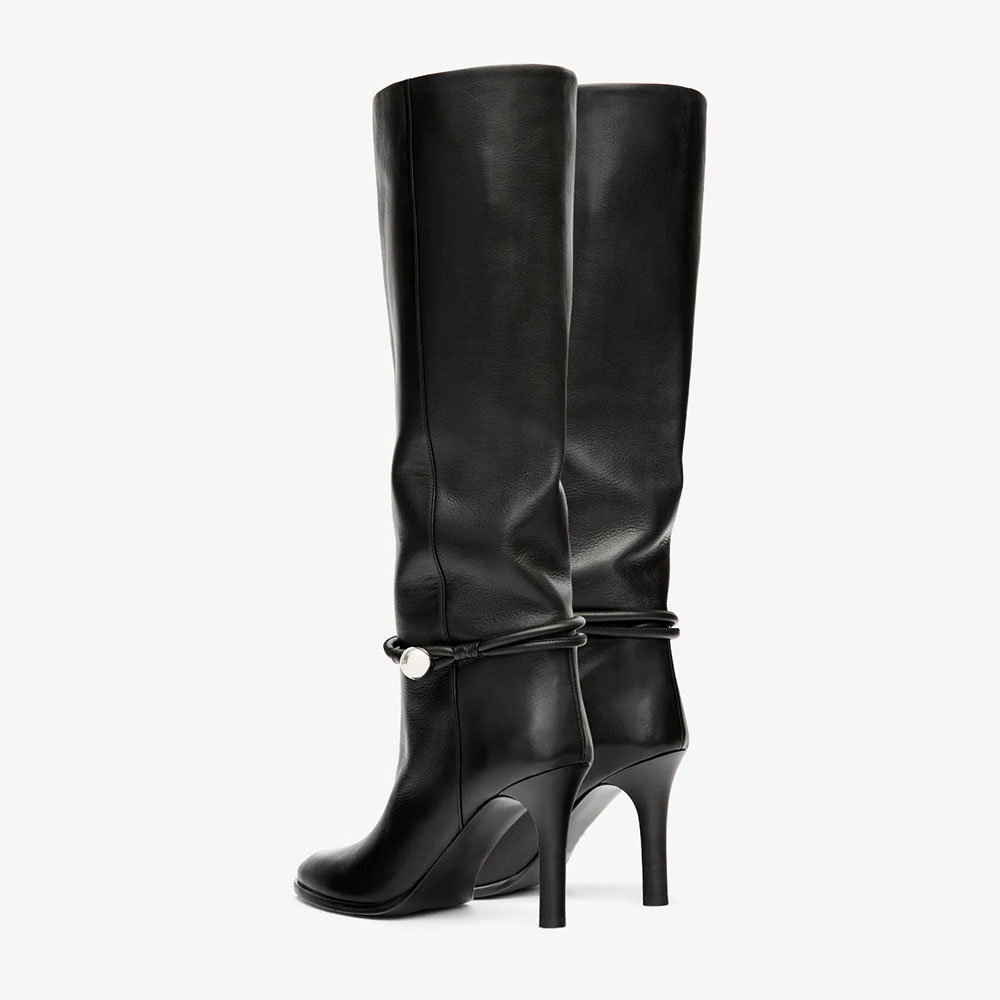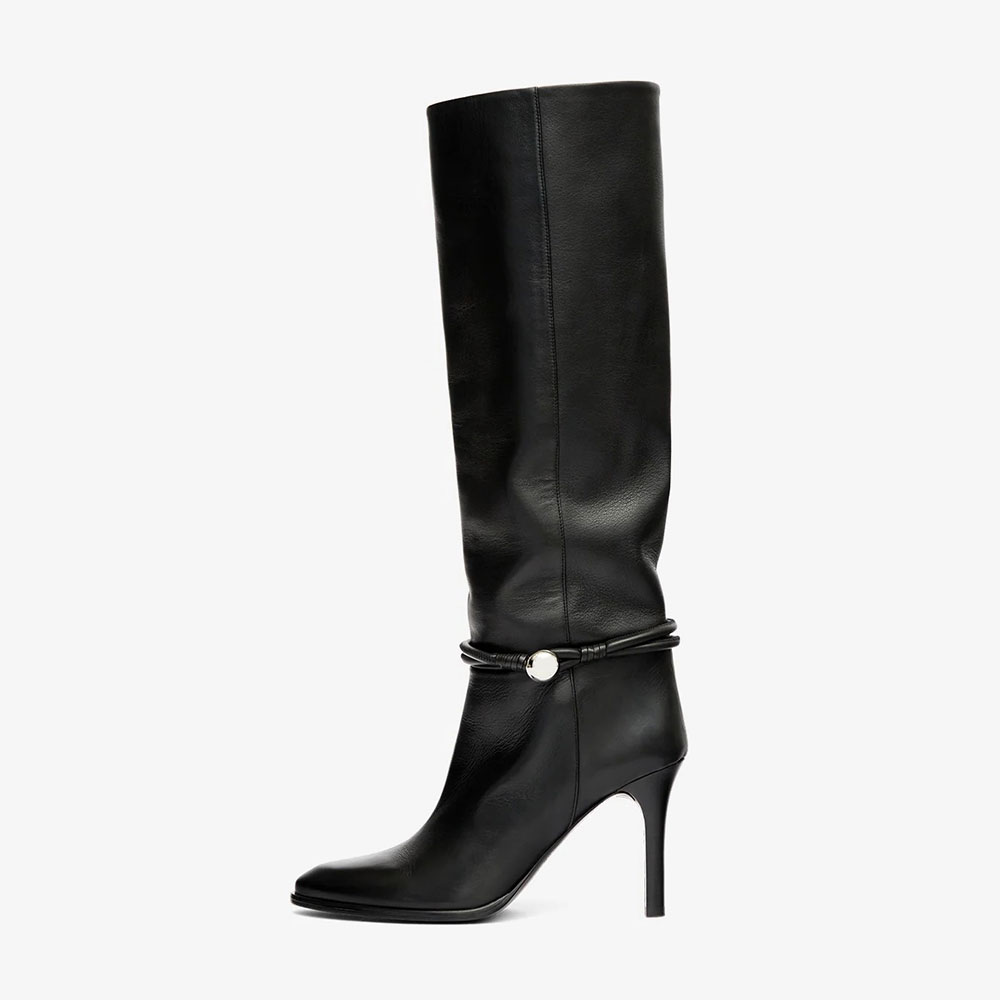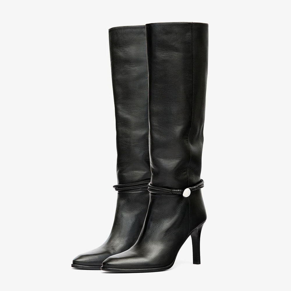 Special Designs: The long boots feature an ankle strap with a silver button, a pointed toe, a slip-on style, a high heel, and a long calf design.