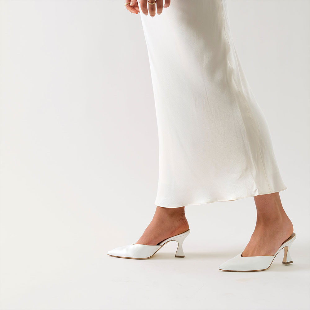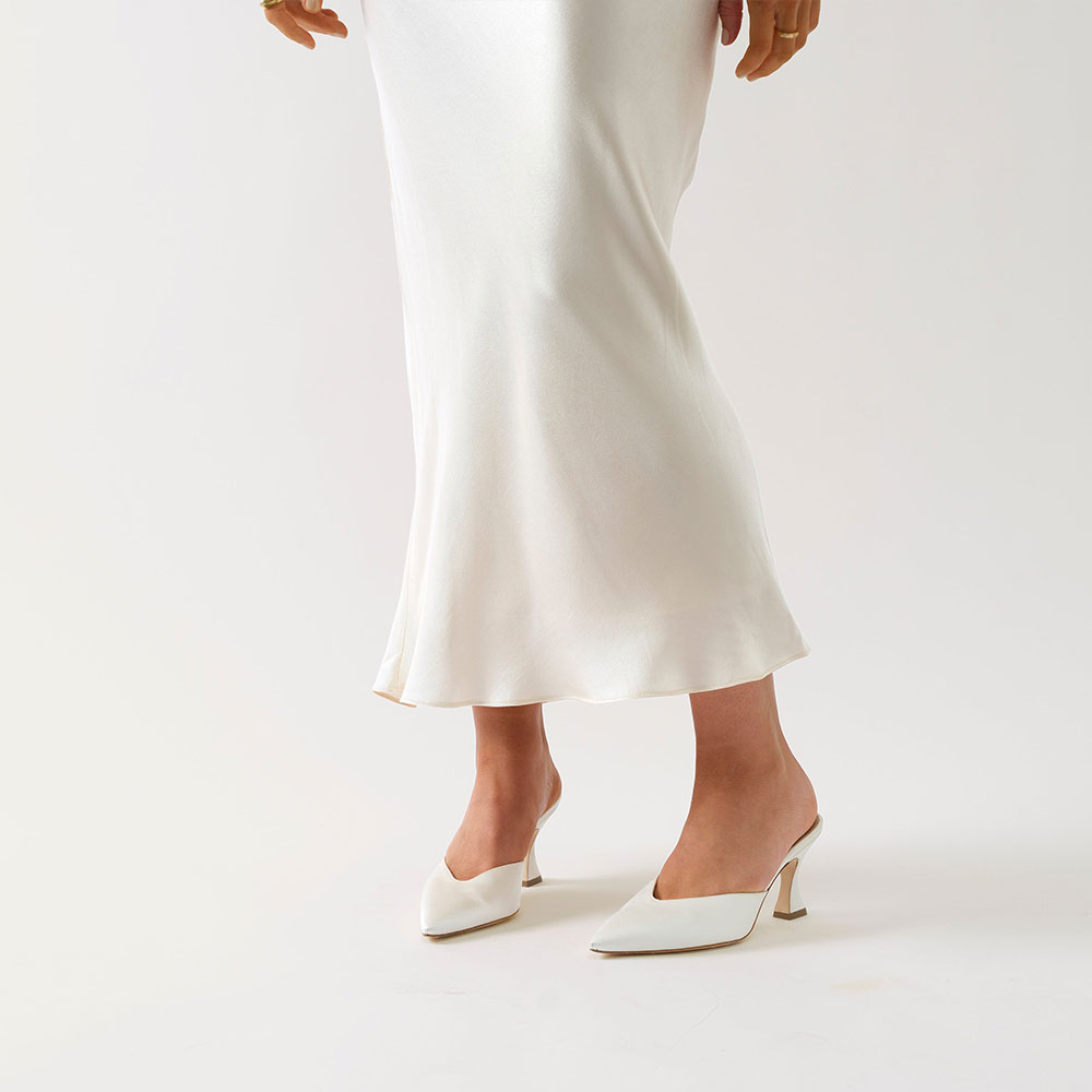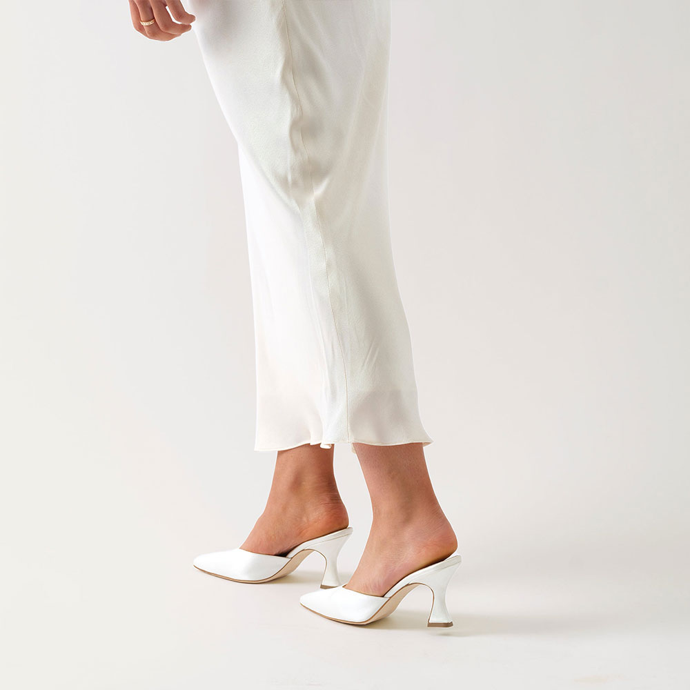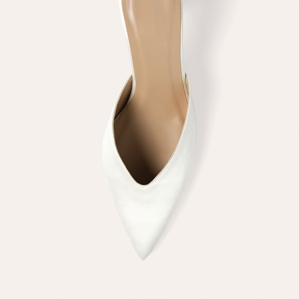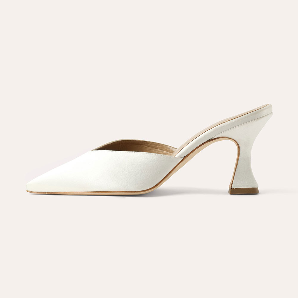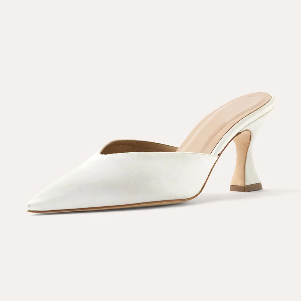 Elegant Ivory Satin Pointed Toe Flared Heel Mule Shoes for Women