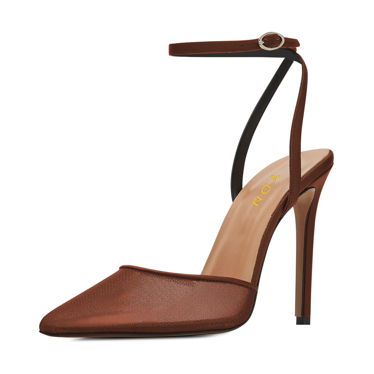 Elegant Mesh & Satin Buckle Fastening Ankle Strappy Brown High Heels