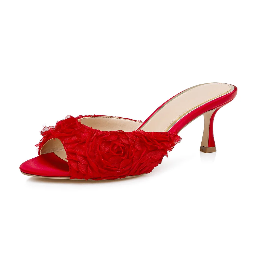 Elegant Red Peep Toe Stiletto Heel Ruffle Slip On Mules for Women