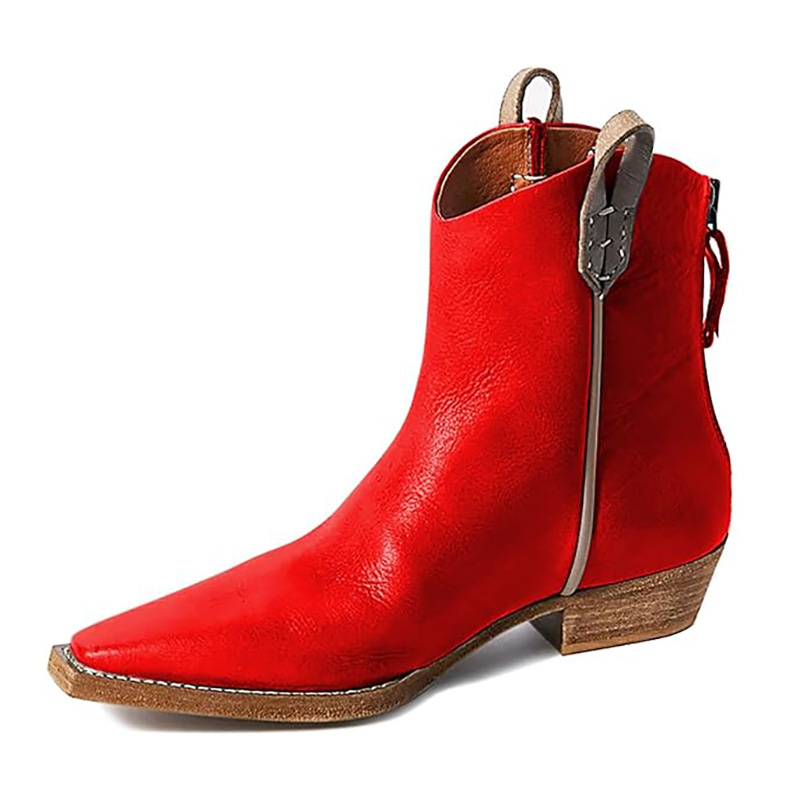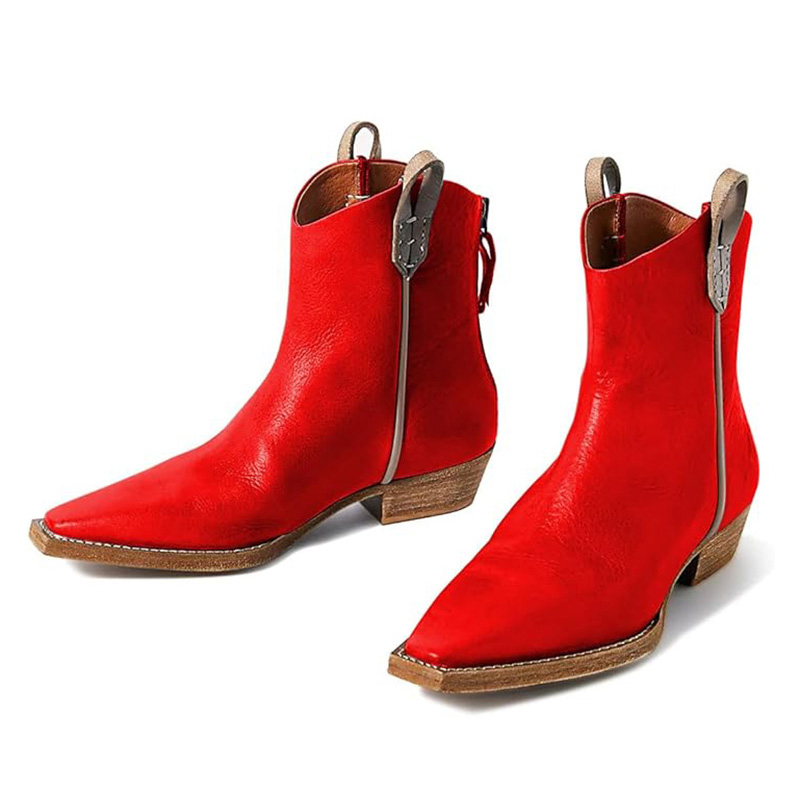 Elegant Vegan Leather Snip Toe Back-Zip Flat Ankle Boots in Red