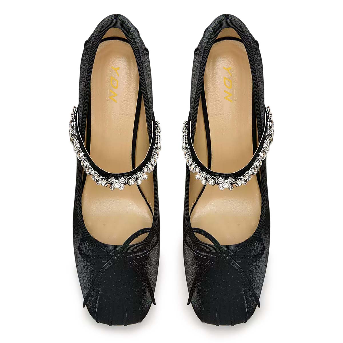 Elegant Velvet Bow Rhinestone Square Toe Flared Heel Black Pumps