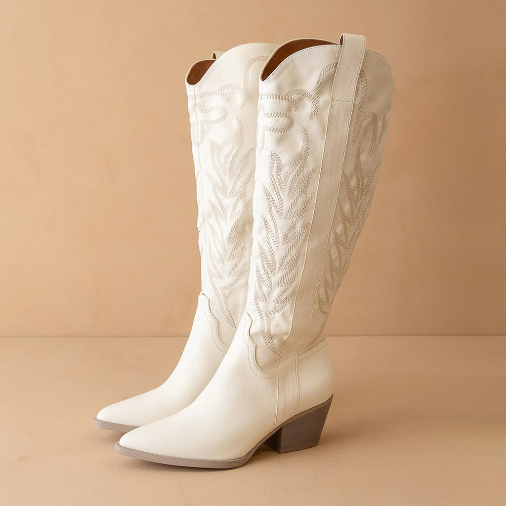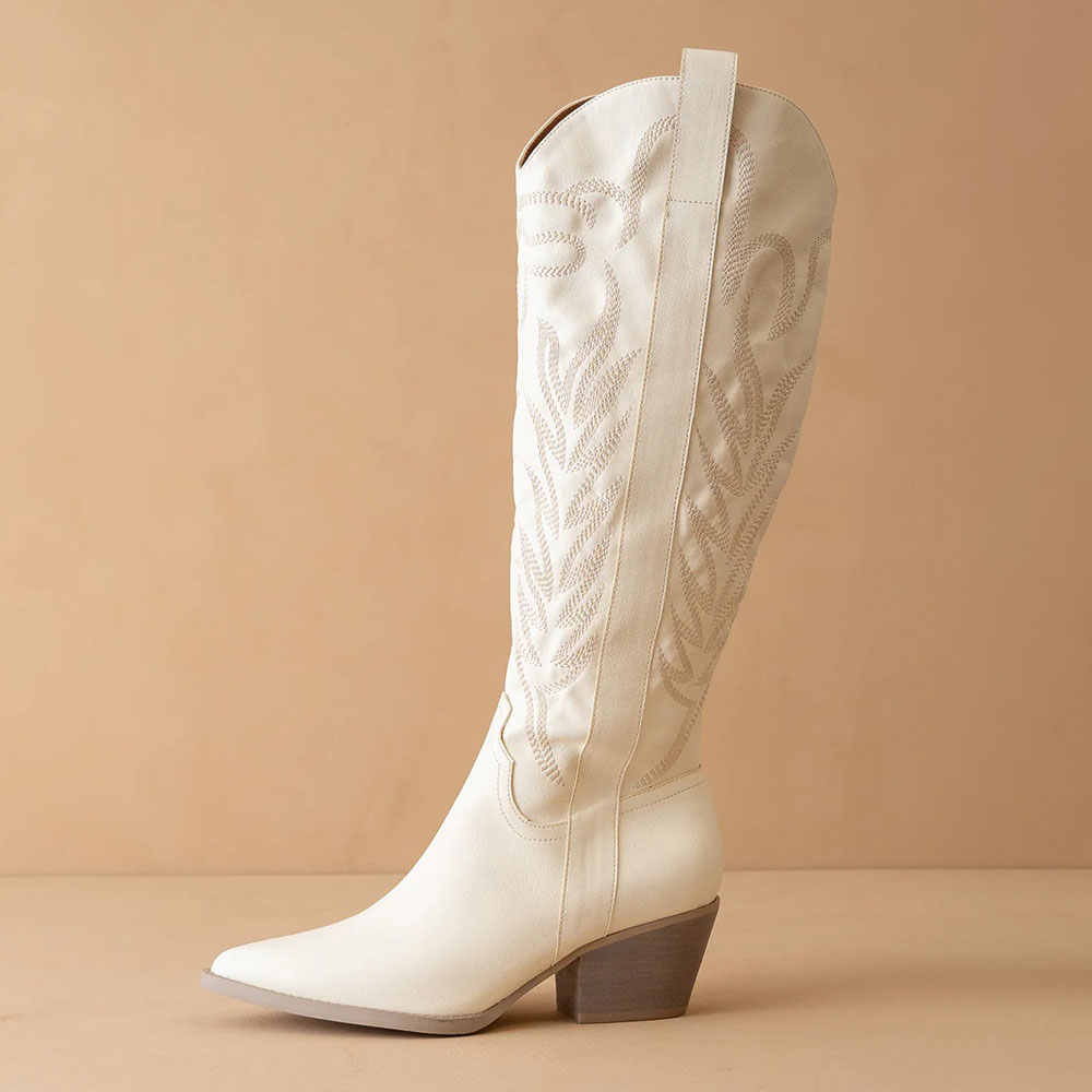 Embroidered Pointed Toe Mid Calf White Cowgirl Boots for Women