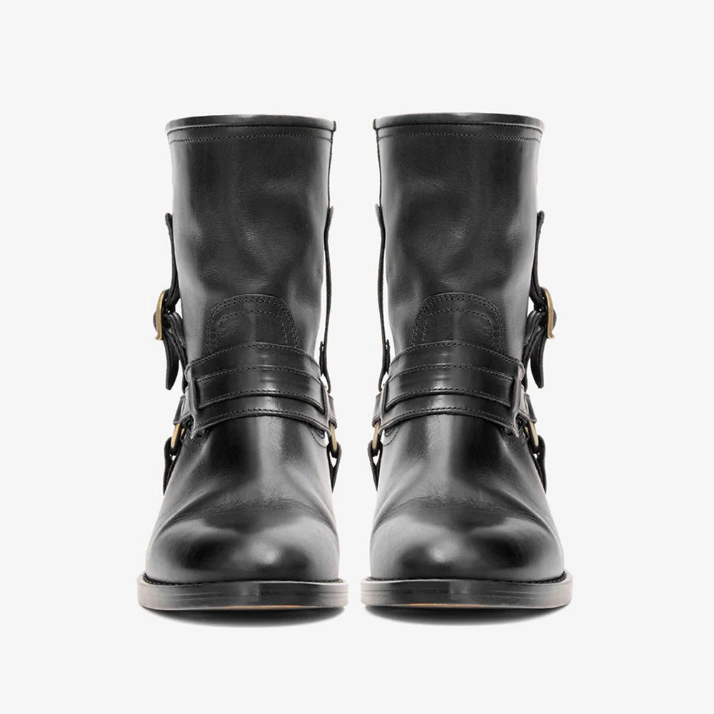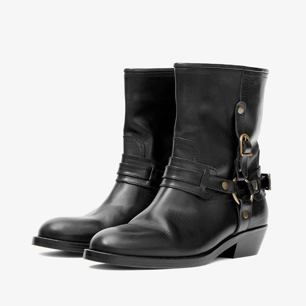 Special Designs: The ankle boots feature a closed toe, a ring, an adjustable buckle, a stud, and a low heel design.